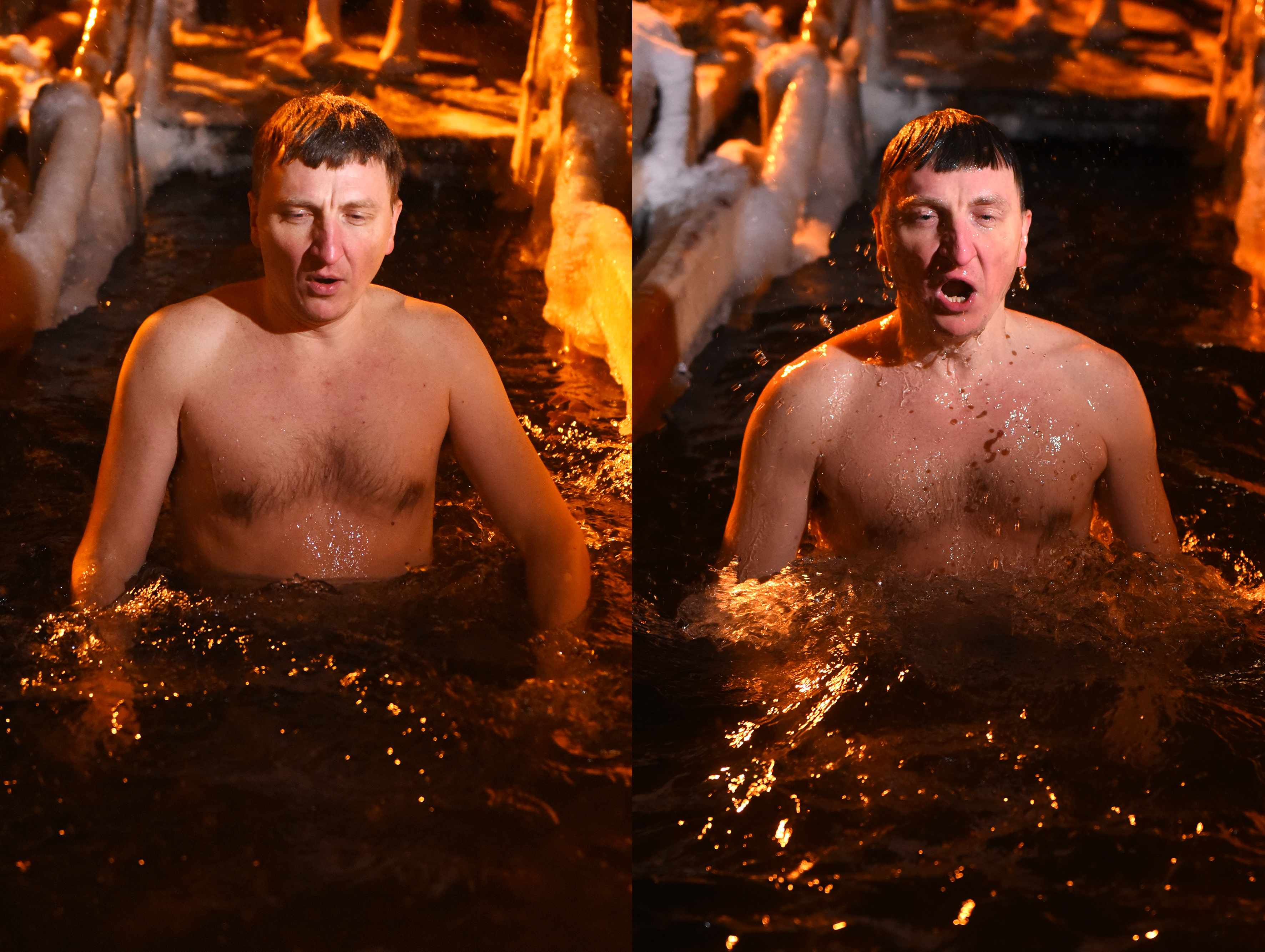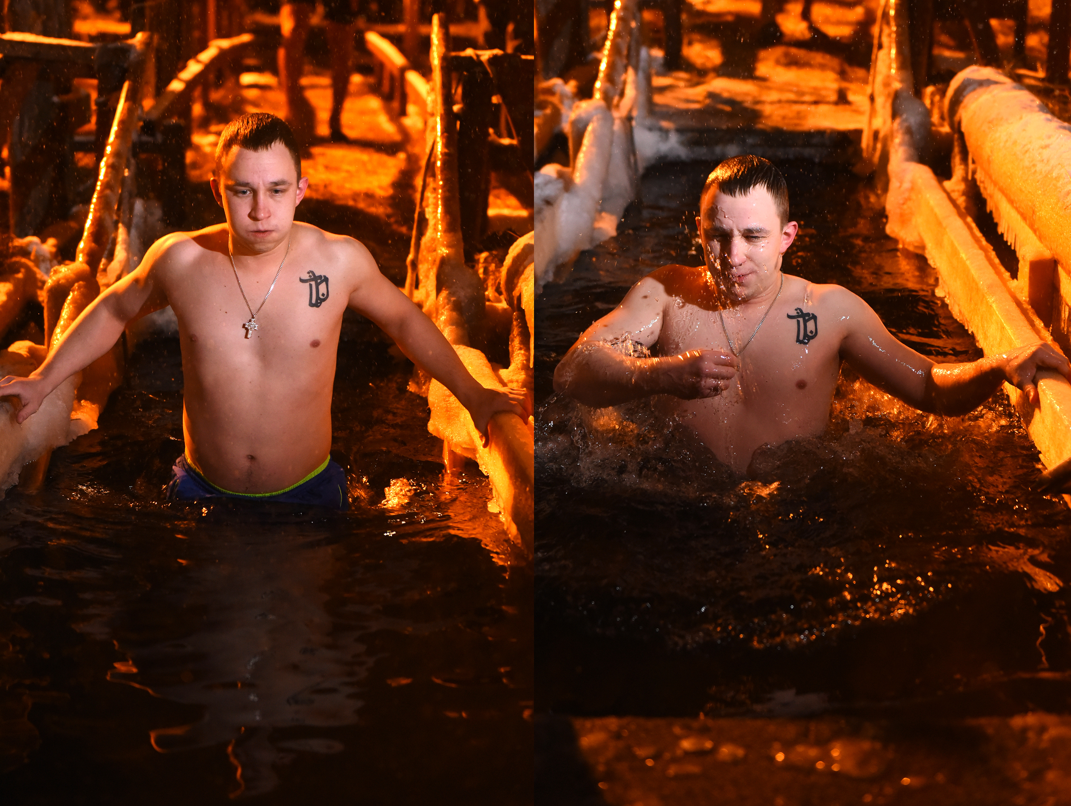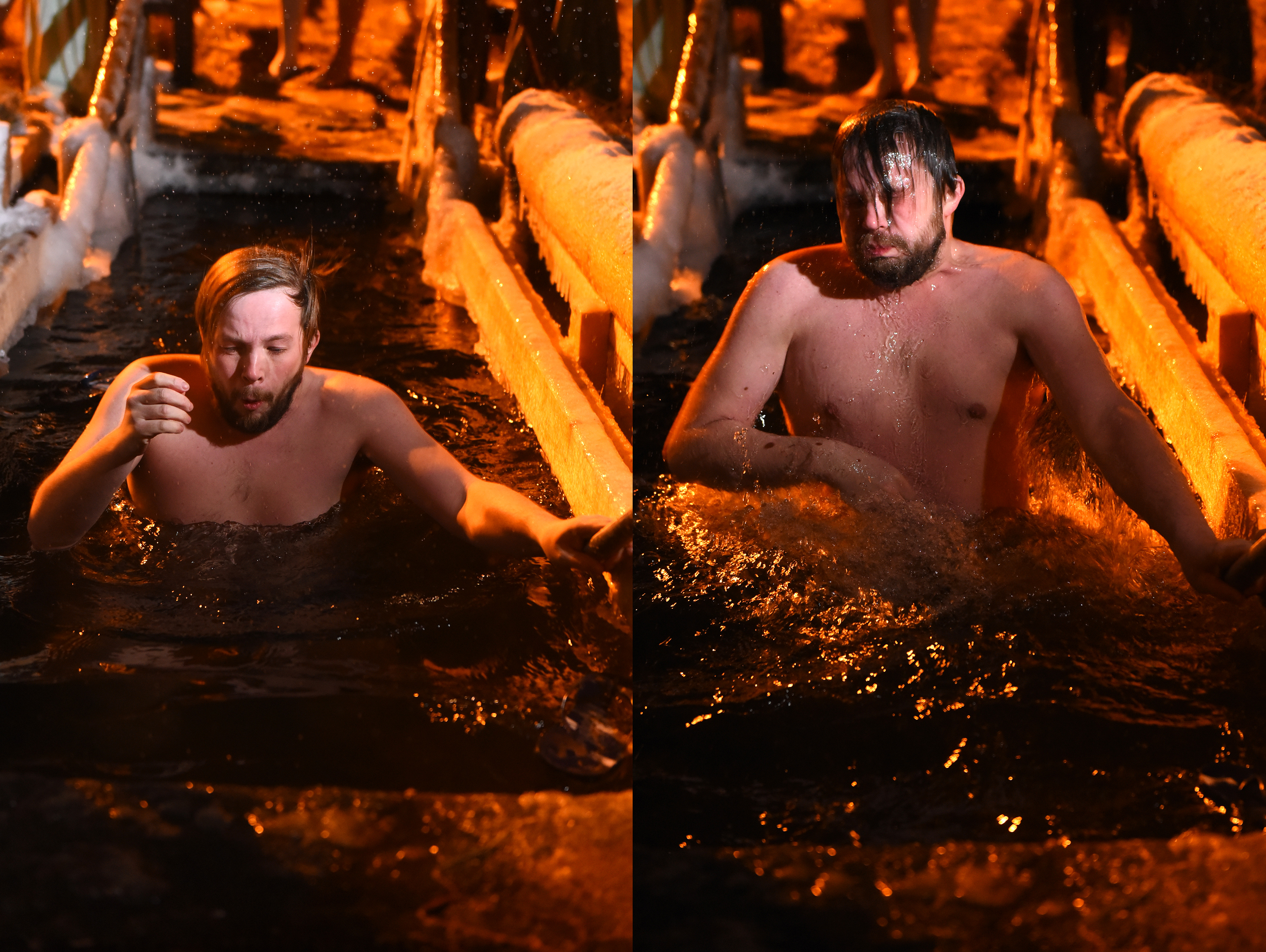 С вечера 18 января в Петербурге начались ежегодные Крещенские купания: горожане окунаются в ледяную воду по всему городу и области. Фотограф Сергей Николаев специально для «Бумаги» сфотографировал купающихся петербуржцев за мгновение до и сразу после погружения в купель.
