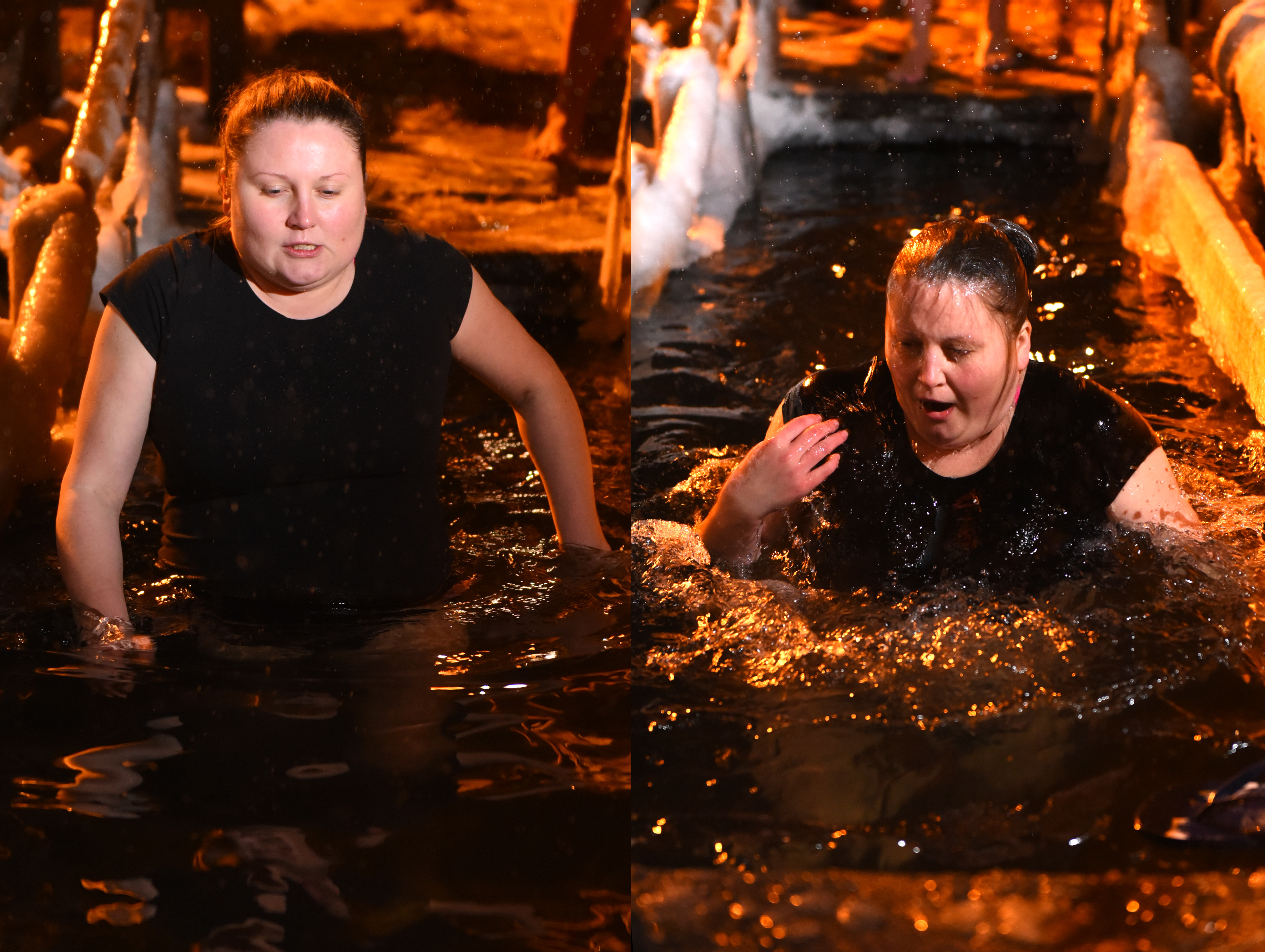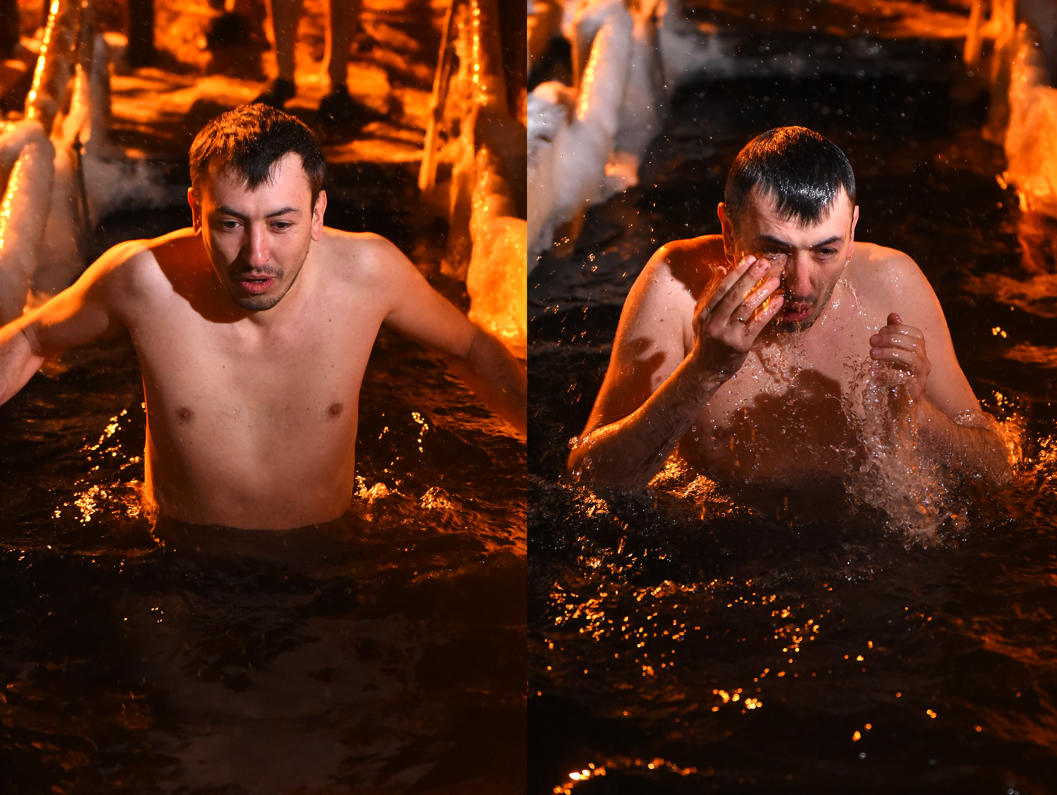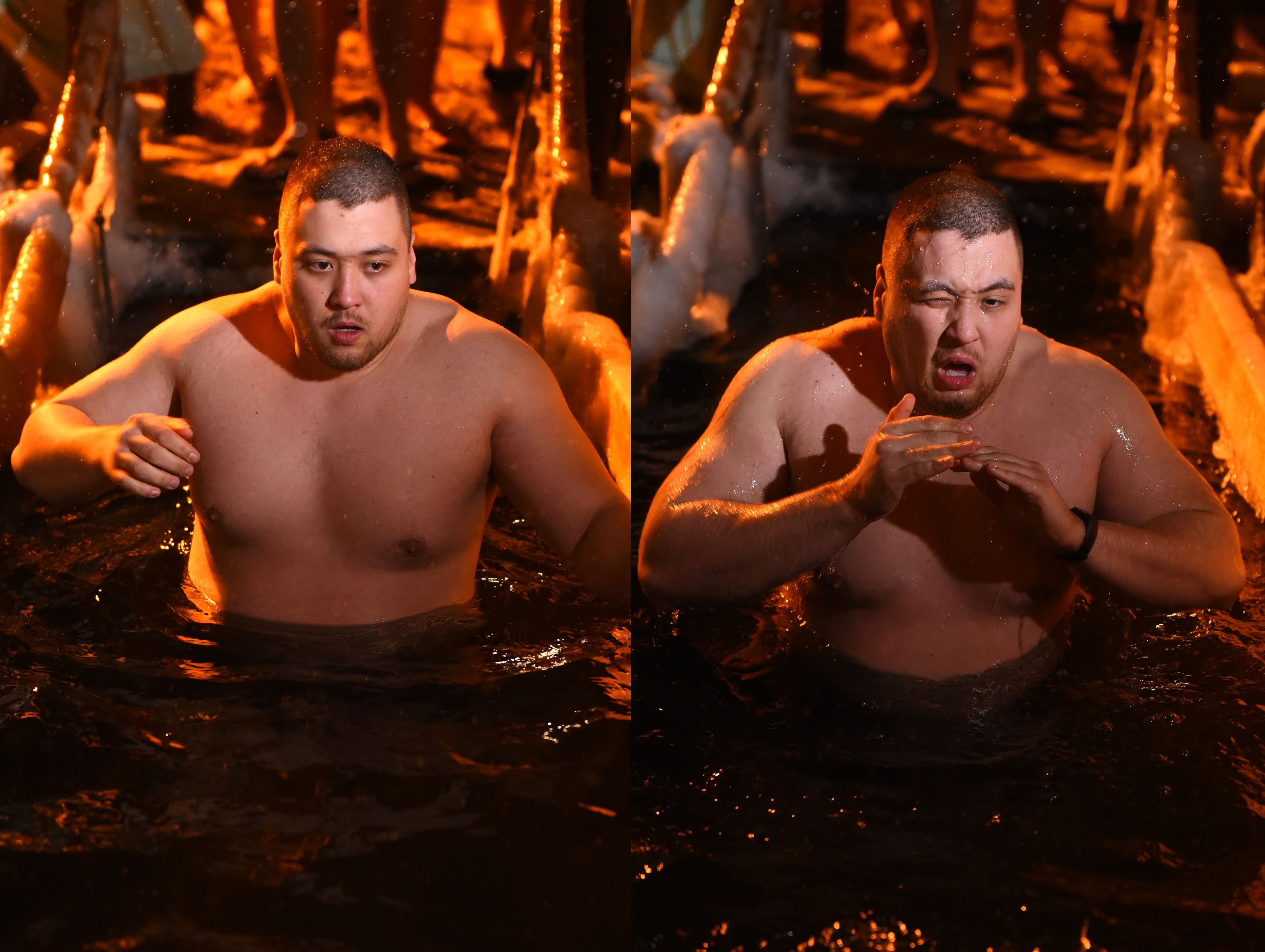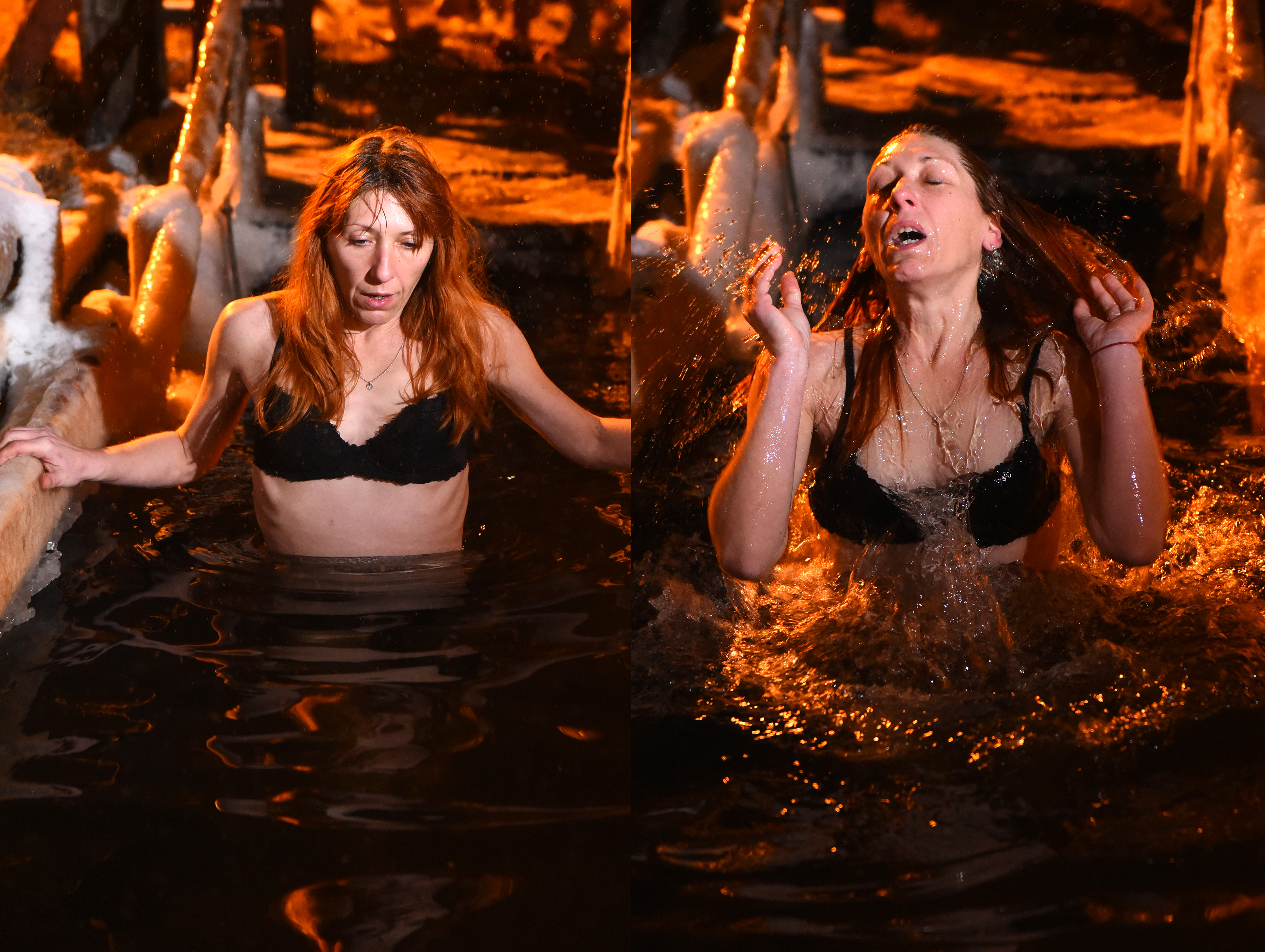 С вечера 18 января в Петербурге начались ежегодные Крещенские купания: горожане окунаются в ледяную воду по всему городу и области. Фотограф Сергей Николаев специально для «Бумаги» сфотографировал купающихся петербуржцев за мгновение до и сразу после погружения в купель.