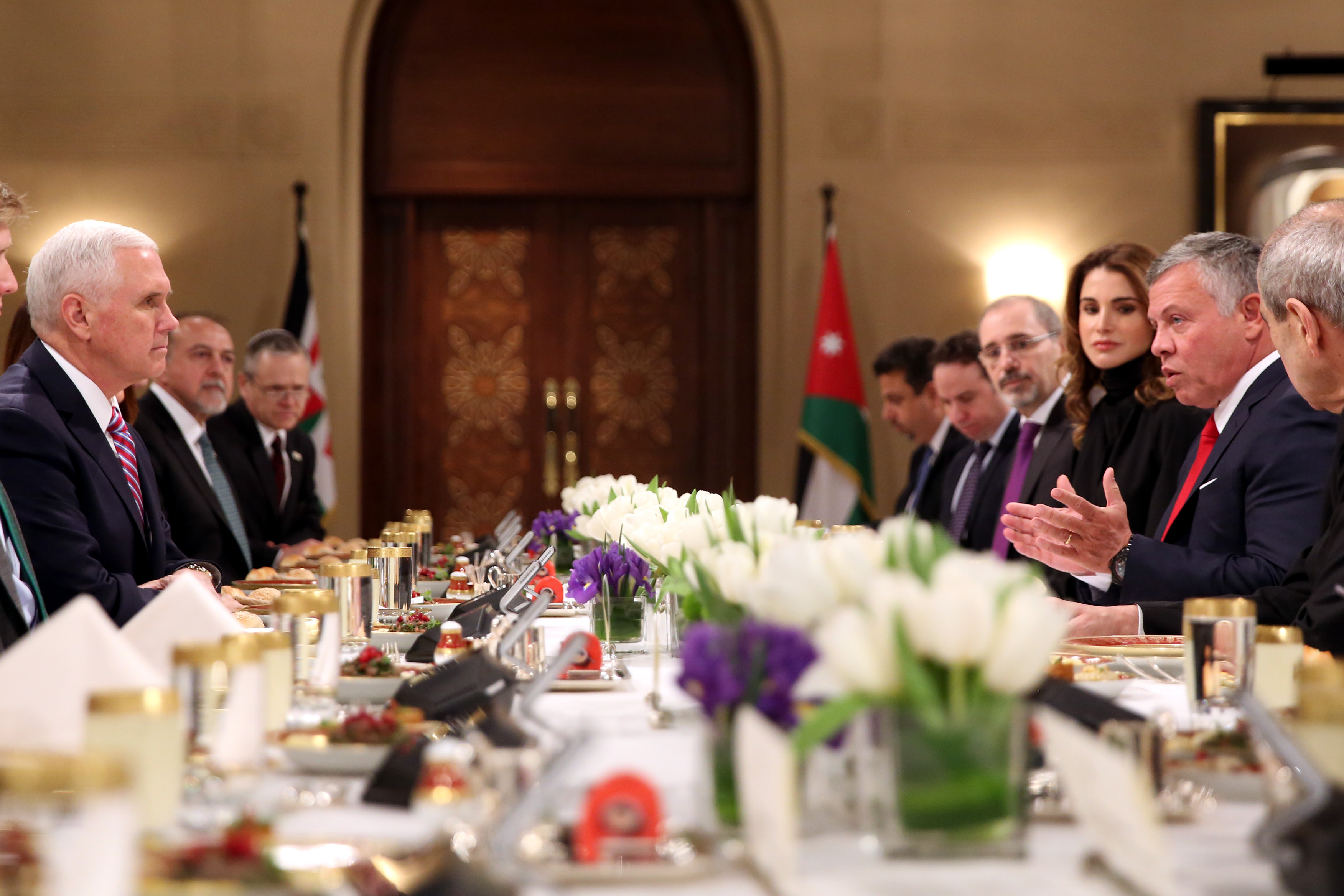 Пенс отметил, что Трамп принял "историческое решение" официально признать Иерусалим столицей Израиля, но он по-прежнему уважает роль Иордании в качестве хранителя Святых мест. Он сказал, что если обе стороны согласятся на решение о двух государствах, Соединенные Штаты поддержат это. Пенс отметил, что США привержены "возобновлению мирного процесса" на Ближнем Востоке.