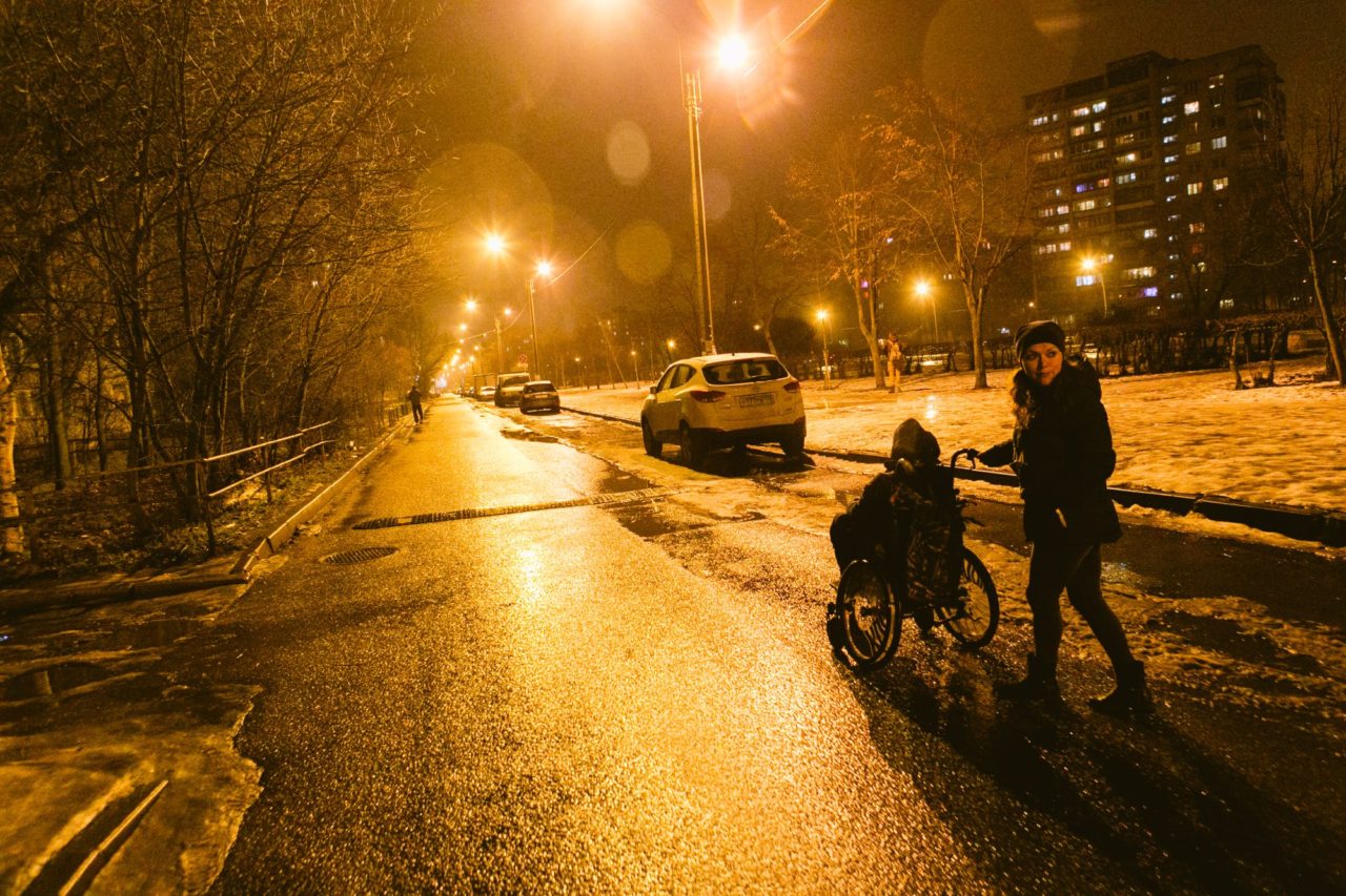 Наташа идет домой к своей подруге Ольге. Леша останется там ночевать, а девушки пойдут в клубФото: Наталья Булкина для ТД Хорошо, что улица хоть как-то освещена — на этой коляске лучше не ездить по наледи. Из-за Нового года рядом с метро много подвыпивших, и Наташа, не стесняясь, прикрикивает: «Осторожно!» Но эта бойкость была не всегда: раньше, например, она стеснялась выходить с маленьким Лешей на площадку возле своего дома, где ее все знали. Она боролась с этим чувством словами «Я тебя не стесняюсь» — твердила их как «Отче наш…»