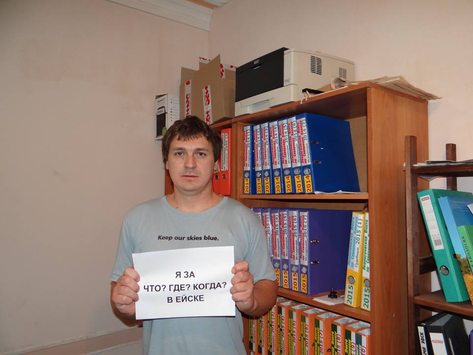«В Ейске чиновники решили запретить детский турнир игры «Что? Где? Когда?» только лишь потому, что его организует муниципальный депутат от «Яблока» и член Совета ЭкоВахты Саша Коровайный. «Потому, что вы оппозиционер» — объяснили ему. И что «недопустимо создавать положительный образ оппозиции в глазах детей». Саша, я предлагаю провести турнир прямо в приемной главы Ейского района. Собраться там, усесться в кружок, пригласить журналистов. Будем создавать положительный образ оппозиции непосредственно там», — написал на своей странице в Facebook заместитель координатора Экологической Вахты по Северному Кавказу Дмитрий Шевченко.