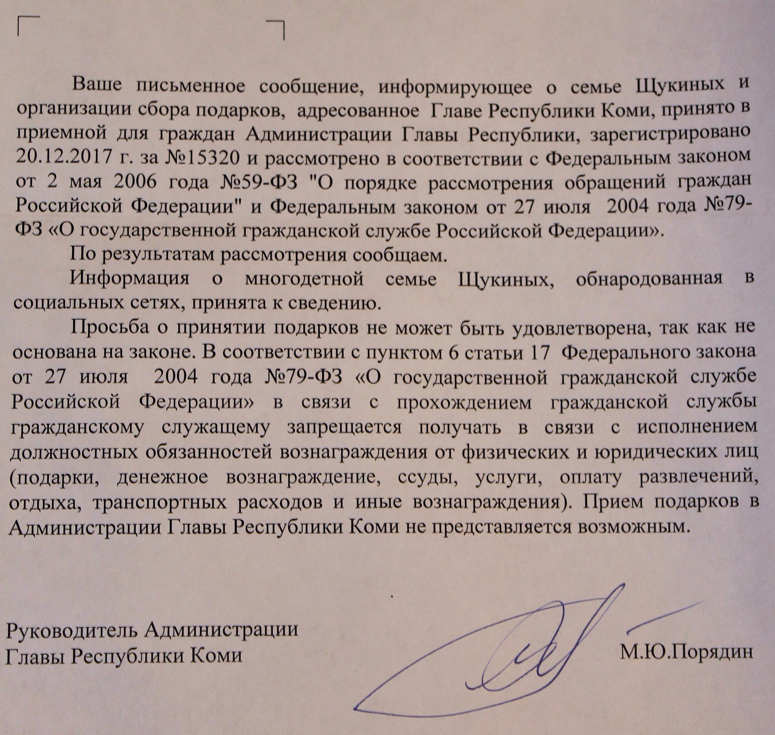 После такого «теплого приёма» я, как нормальный человек и гражданин РФ, обратилась в прокуратуру Сыктывкара, считая действия сотрудников администрации противозаконными (сбор подарков был проведён на публичном мероприятии, к тому же на сумму меньшую 3000 тыс. руб. что позволяет принять дары) и обратилась с письмом к ПРЕЗИДЕНТУ ПУТИНУ, поведав в нем об истории семьи Щукиных и скупом главе, а так же о выброшенных подарках.