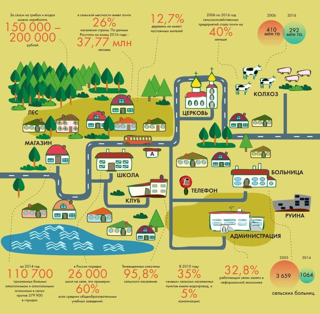 Сельская Россия — это цивилизация развалинНесмотря на это, в сельской местности по-прежнему живет почти 26% населения страны. По данным Росстата на конец 2016 года — 37,77 миллионов человек. Конечно, 137 тысяч крестьянских и фермерских хозяйств и 36 тысяч сельхозпредприятий не хватает, чтобы обеспечить их работой.