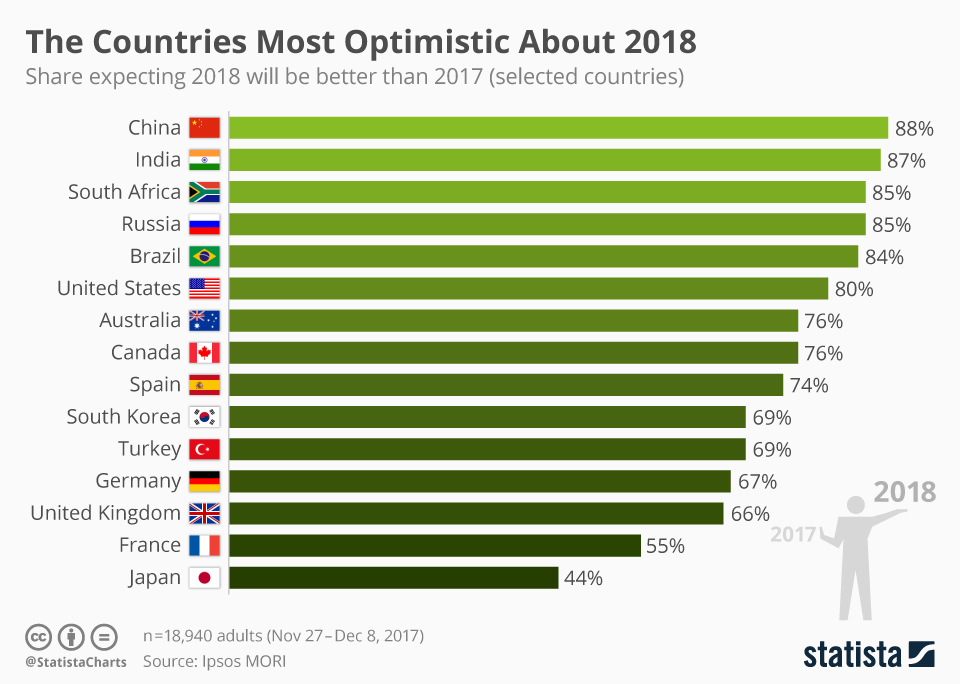 Чем в среднем старше население страны, тем оно позитивнее — с самым большим оптимизмом ждут 2018 года в «молодых странах» Латинской Америки вроде Колумбии и Перу (93% оптимистов), а меньше всего оптимистов — в «старой» Японии (44%). При этом сравнительно немолодые россияне на фоне собственных рекордных долгов на 2018 год смотрят предельно радостно — 85%, между США (80%) и Китаем (88%):