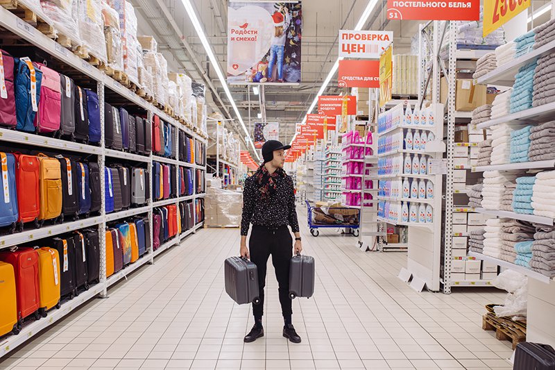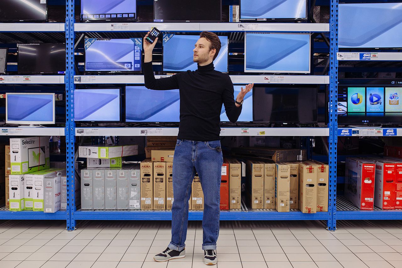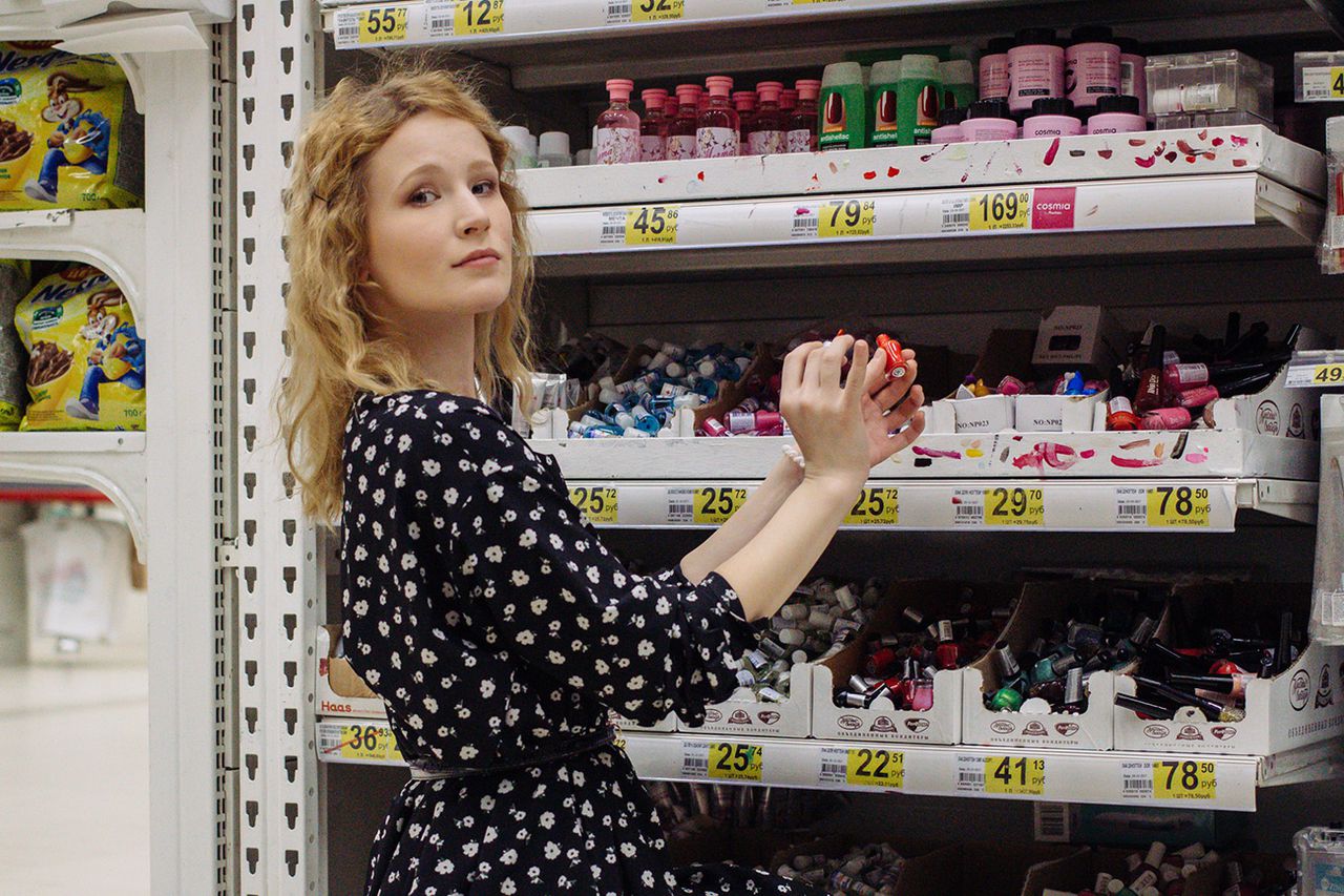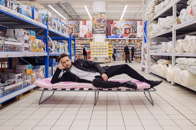 Саша собирает цельные образы из ашановской одежды не дороже 3000 рублей, фотографируется среди полок гипермаркета и выкладывает их в инстаграм cheap_sasha. Так он демонстрирует, что в дешёвой одежде можно выглядеть хорошо. Пока Саша тащит в наш съёмочный угол гироскутер из соседнего отдела, мужик рядом пытается померить тренировочные штаны на джинсы: ни те ни другие ему не идут. Саша возвращается, натягивает чёрную водолазку, чуть ли не такие, как у мужика, джинсы и мчится на «реквизитном» гироскутере к отделу с телевизорами, будет изображать Стива Джобса. Не очень-то честный проект: ему идет всё, потому что он похож на молодого Джима Керри.