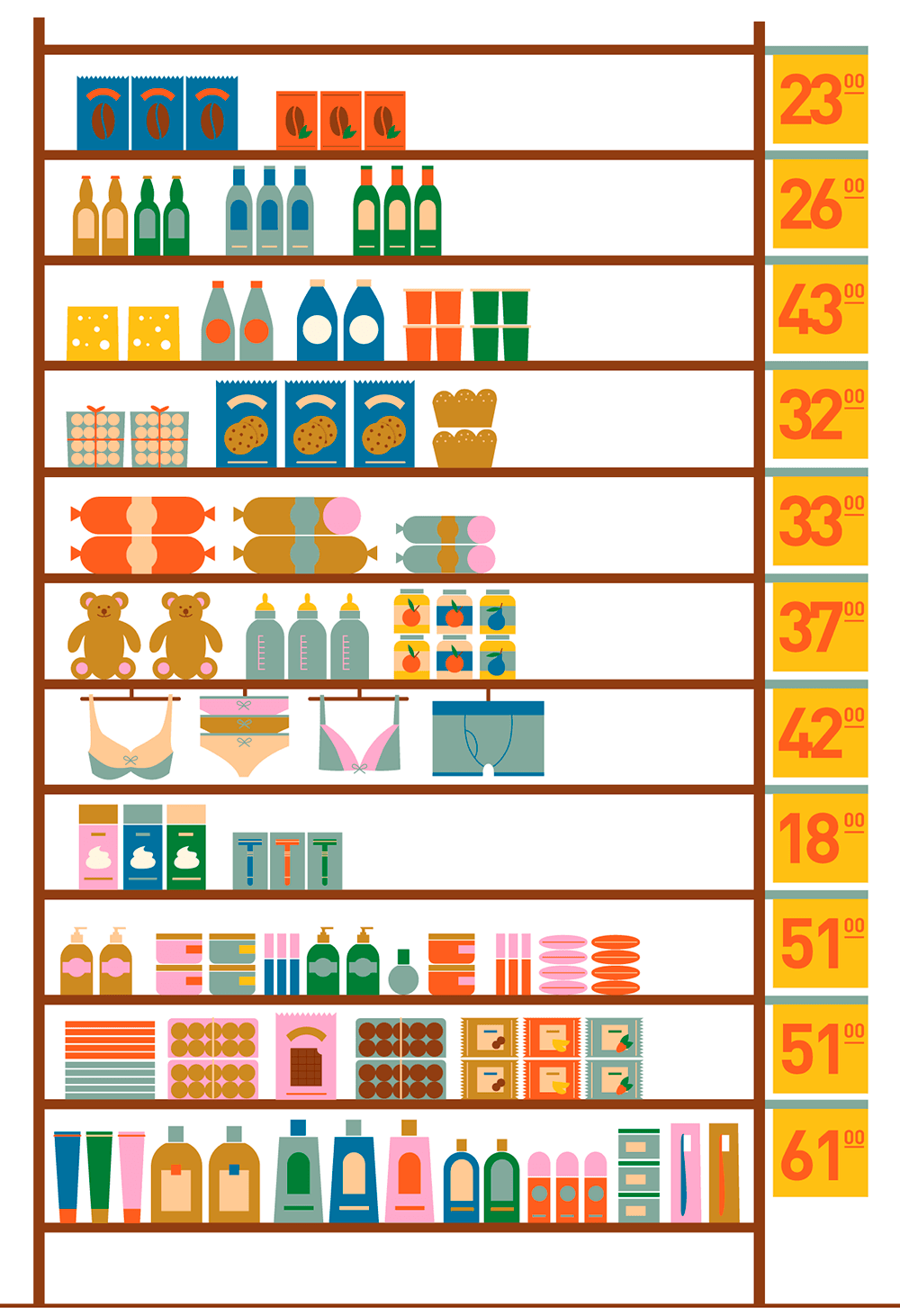 Чаще всего люди пытались стянуть шоколад, колбасу, кофе и пену для бритья. Самую большую категорию украденного составили средства гигиены: гели для душа, шампуни, косметика. Многие приходили в «Ашан» за нижним бельём и носочками. Спрос на алкоголь — низкий, примерно такой же, как на выпечку к чаю. Бóльшую часть краж совершали зимой, потому что продукты удобнее выносить под одеждой. Интересный всплеск был зарегистрирован нами накануне 1 сентября: перед началом нового учебного года взрослые «собирали» детей в школу, похищали школьные принадлежности и, что немаловажно, игрушки.
