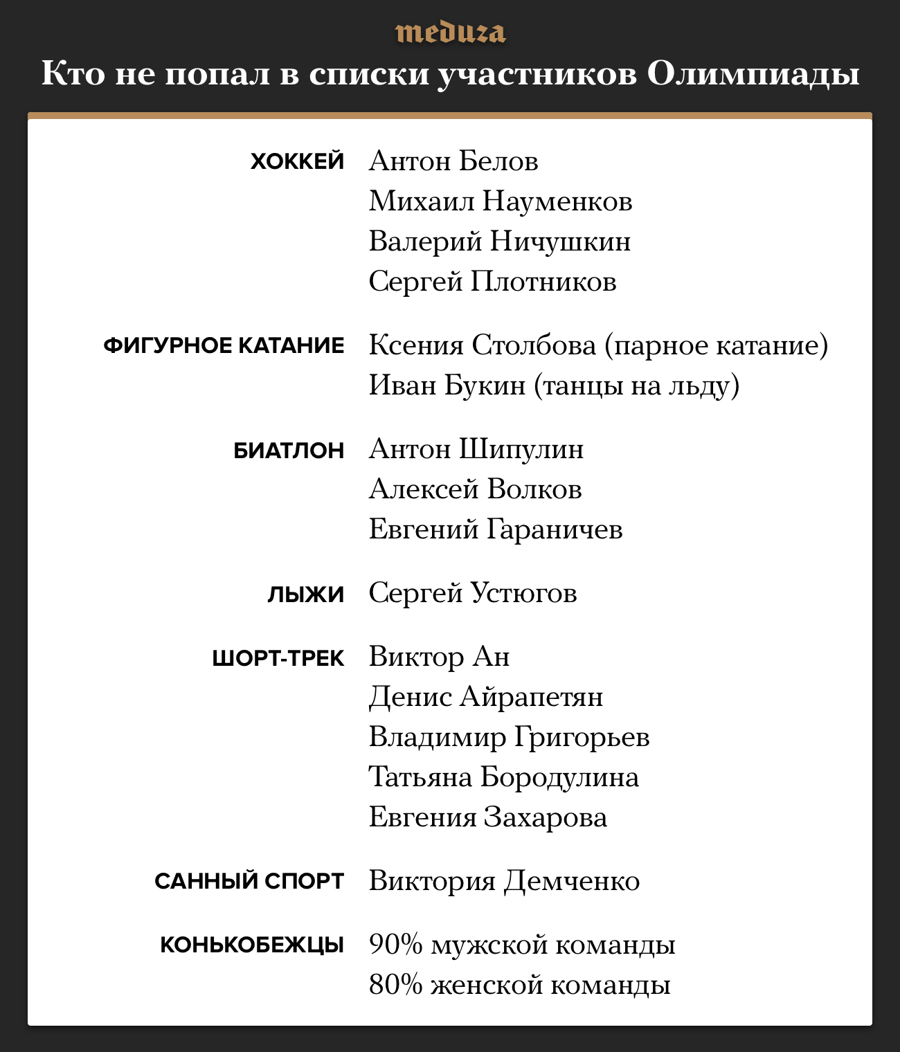 В предварительный список российских атлетов, допущенных до Олимпиады в Пхенчхане, не попали лидеры в нескольких видах спорта. Окончательный список допущенных до участия в Играх станет известен 28 января. Ранее Международный олимпийский комитет (МОК) заявил, что из 500 россиян, подавших заявки на участие в Олимпиаде, до Игр не допущены 111 спортсменов.