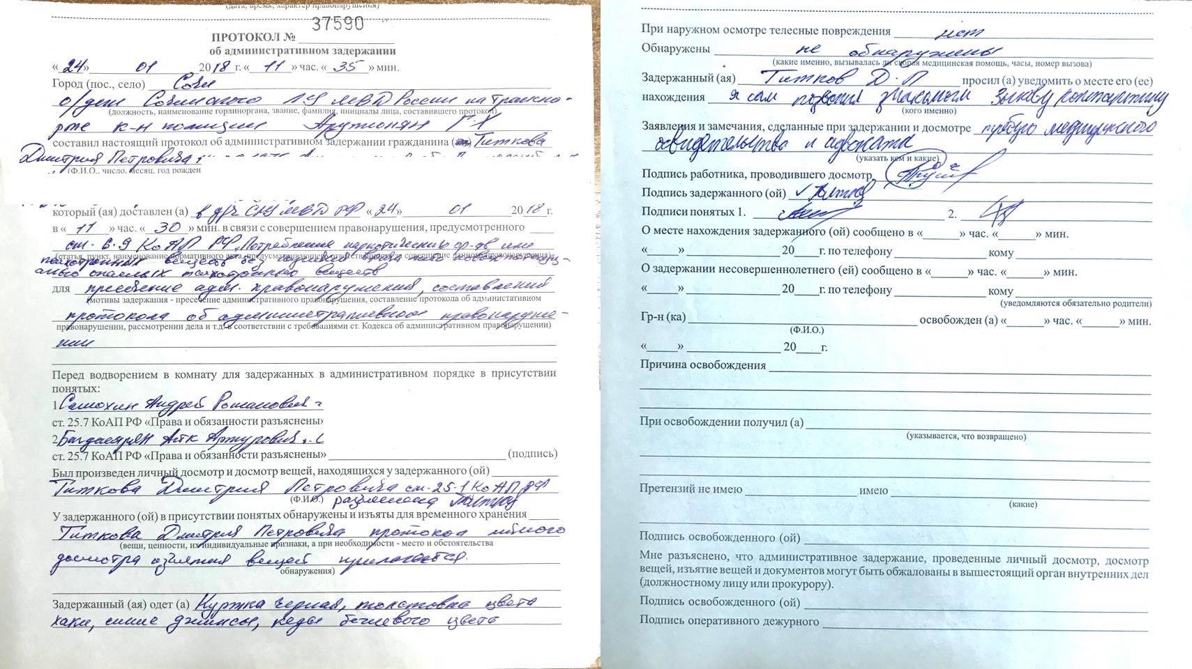 — К нему подошли сотрудники полиции, не представились, потребовали предъявить документы, а потом отвели на личный досмотр, — пишут сочинские активисты в группе Команда Навального | Сочи. — После досмотра с него требовали поехать на освидетельствование, от которого он, со слов полиции, не имел права отказаться (при том, что закон даёт такое право). Дмитрий согласился. Поехал. И что вы думаете? На него составляют протокол по ст. 6.9 КоАП РФ — отказ от освидетельствования.