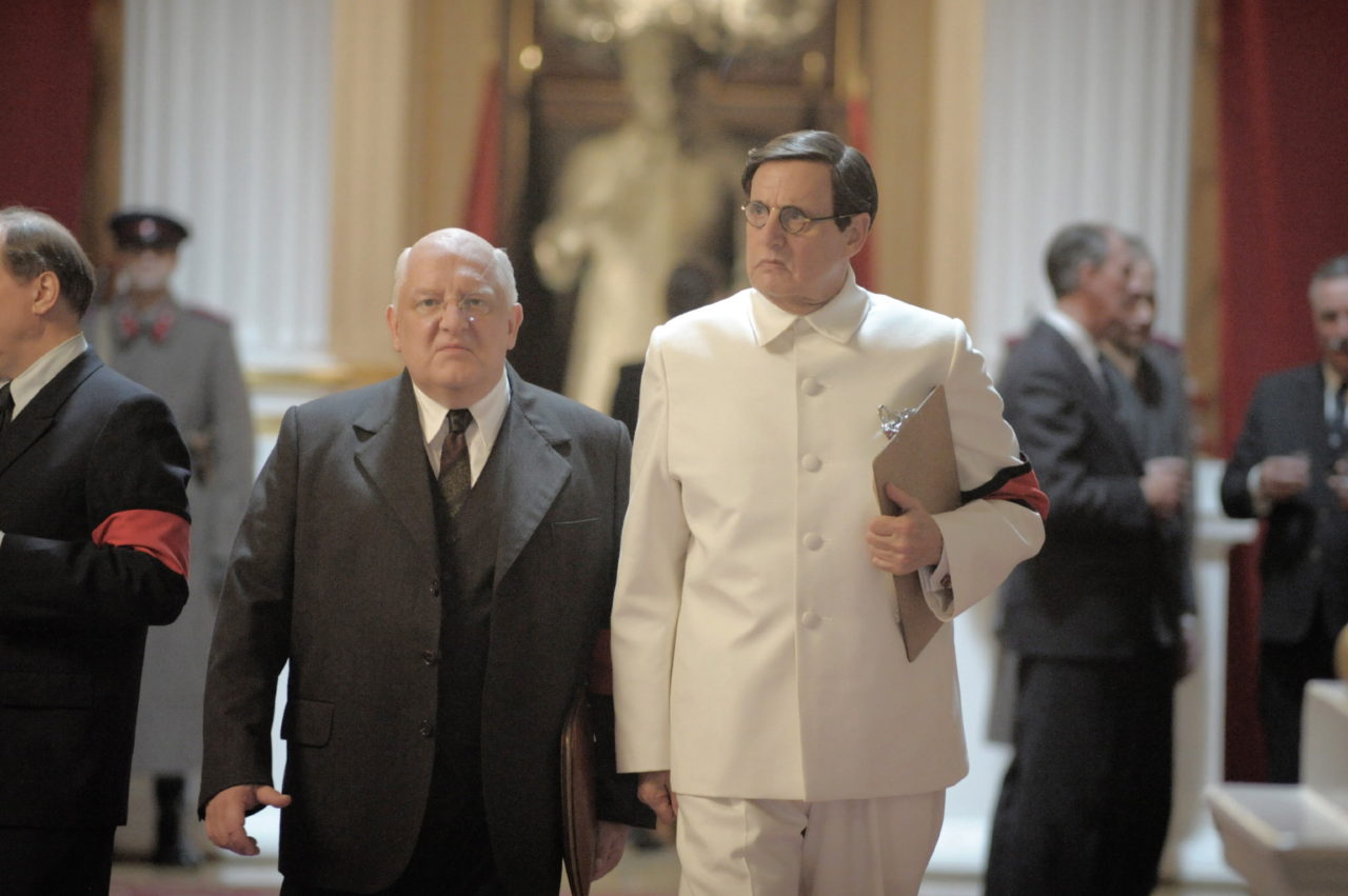 У каждого здесь свой оттенок мерзости, свое экранное кредо. Хрущев — коварство. Берия — непомерное властолюбие. Молотов — хамелеон. Майкл Пейлин, выдающийся английский комик, играет Молотова как образец органической, нутряной подлости, позволяющей такие несовместимые в нормальном человеке вещи, как любовь к жене и одобрение сталинского приговора ей. Булганин — человек-желе, вечно трясущийся то от страха, то от подозрений, то от предвкушений. Маленков — мини-Наполеон, вчера заснувший шестеркой при Сталине, а проснувшийся главой государства, оттого надутый сверх меры, но не знающий, что делать со свалившейся на него властью. Жуков — рубаха-парень, ставящий точку в тянущейся борьбе за власть, помогающий Хрущеву всех перехитрить. А все они вместе — воплощенная трусость, глупость и некомпетентность.