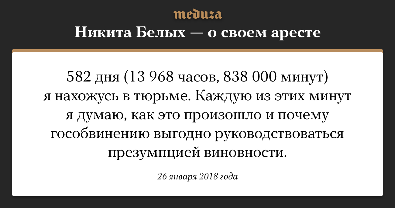 Бывший губернатор Кировской области Никита Белых на суде по делу о взятке воспользовался правом на последнее слово и в течение часа рассказывал судьям свою версию произошедшего. «Медуза» публикует последнюю, самую эмоциональную часть его речи. Оглашение приговора по делу Белых, которое идет уже полтора года, назначено на 1 февраля.