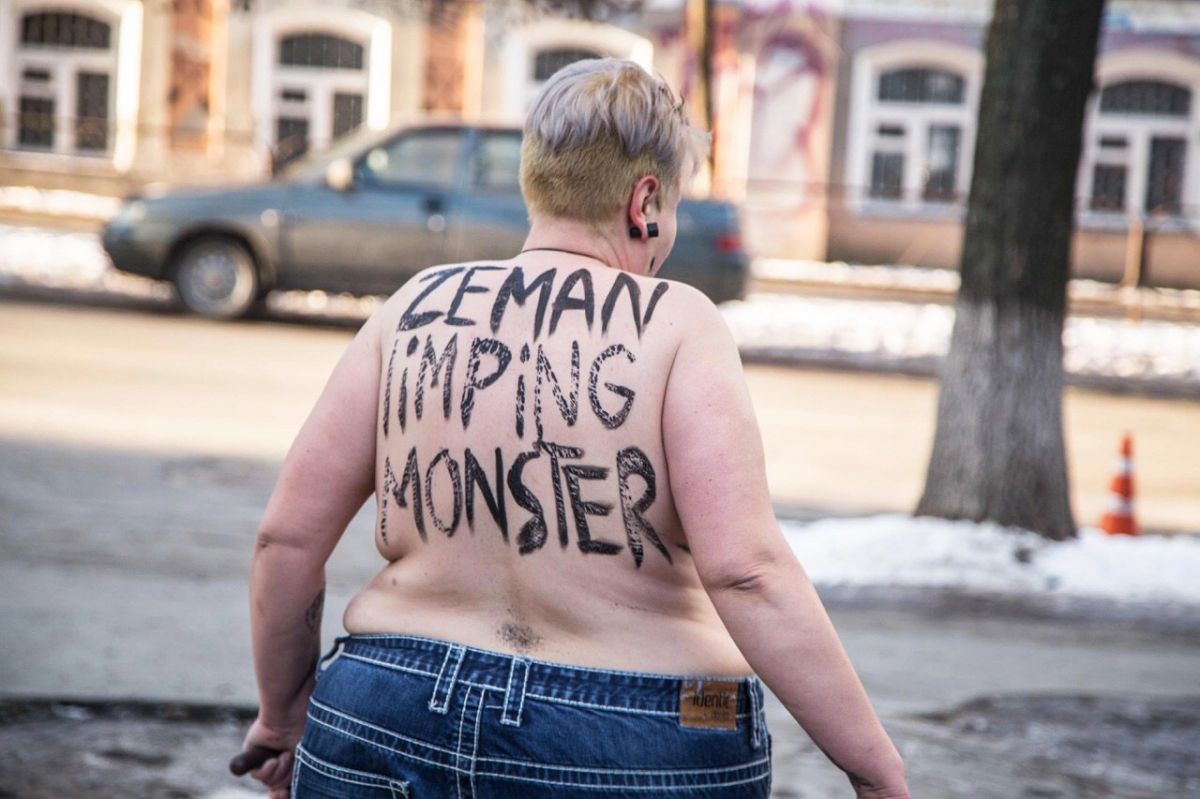 Немчинова разделась на улице и продемонстрировала надписи на ее теле: «Земан хромой монстр». Президента Чехии называют «другом Москвы», и в FEMEN считают, что его победа означает «смерть свободной Чехии».