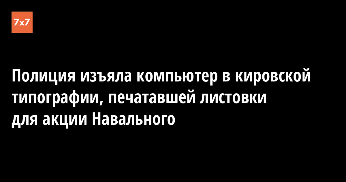 В Кировскую цифровую типографию 26 января пришла полиция. В этой типографии печатались листовки к «Забастовке избирателей», которую 28 января планирует провести кировский штаб Алексея Навального. О визите силовиков корреспонденту «7x7» сообщил управляющий партнер типографии Николай Плюснин.