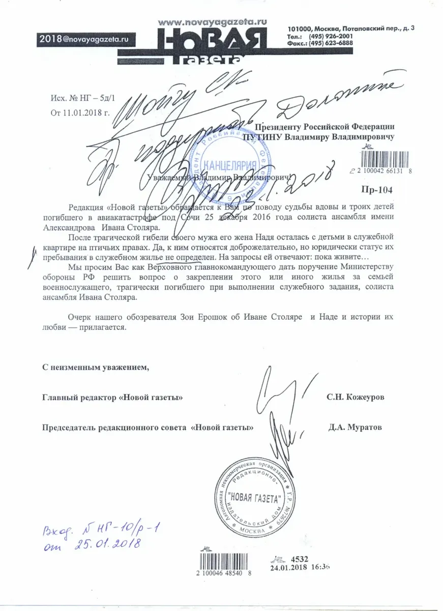 На недавней встрече Владимира Путина с руководителями федеральных СМИ главный редактор «Новой» Сергей Кожеуров среди других вопросов о политической ситуации в стране (например, о преследовании силовиками «мемориальцев» Юрия Дмитриева и Оюба Титиева) поднял и этот — о судьбе вдовы военнослужащего и его многодетной семьи. Редакция «Новой газеты» просила Верховного главнокомандующего дать поручение Министерству обороны РФ решить вопрос о жилье семьи военнослужащего, трагически погибшего при выполнении служебного задания.
