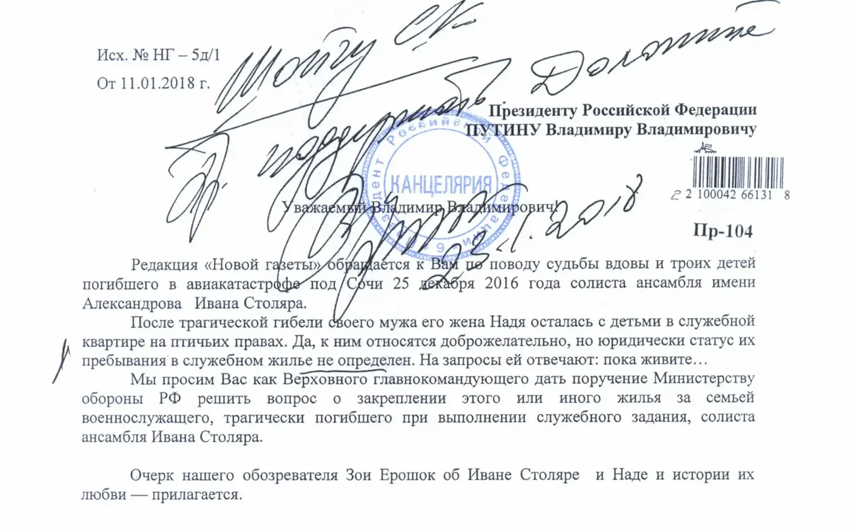 И вот такое поручение дано. На письме редакции — резолюция президента России: «Шойгу С.К. Прошу поддержать. Доложите».