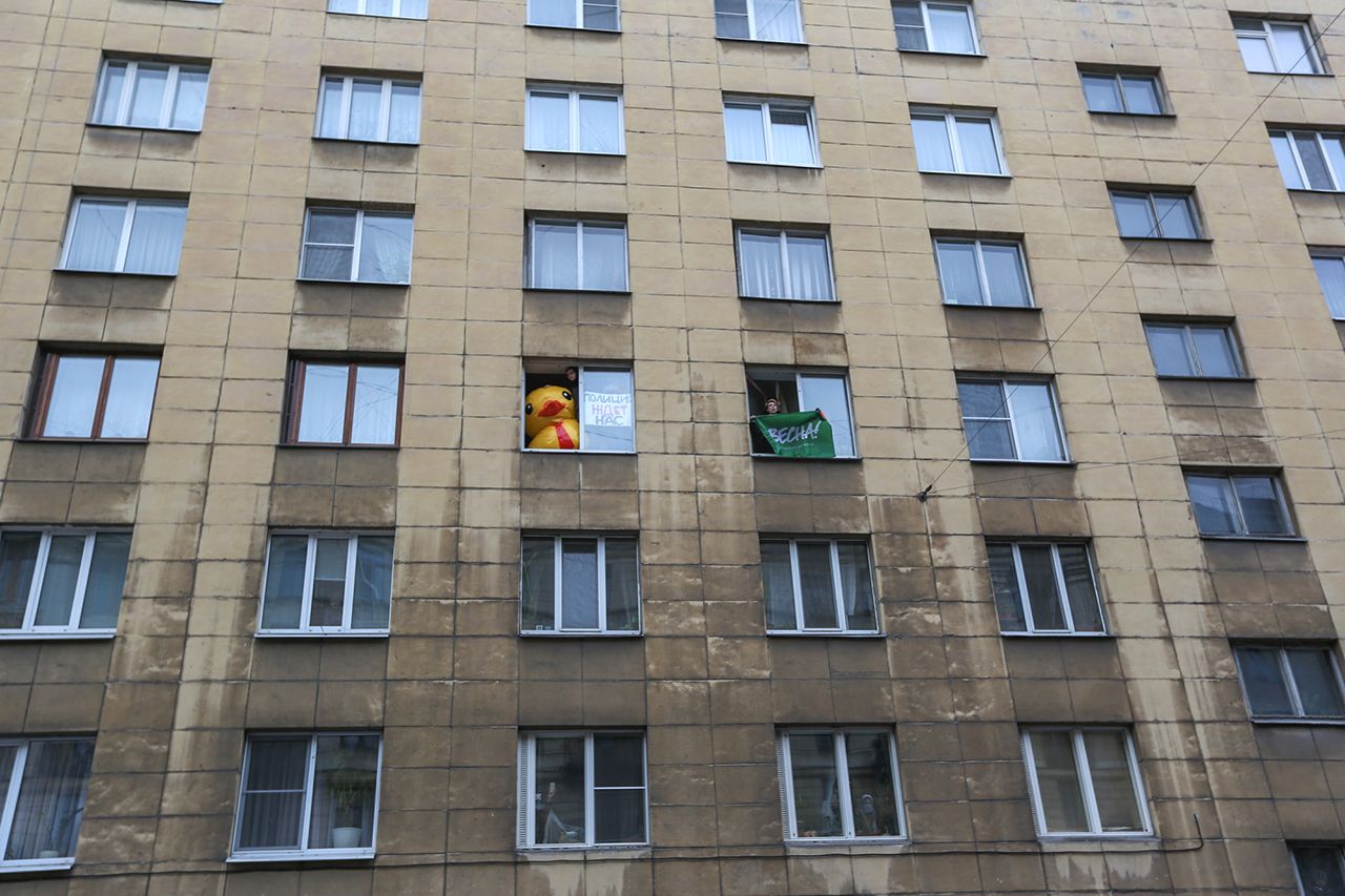 Окно дома напротив открылось, и в нем показалась гигантская резиновая желтая утка — в Петербурге ее помнят, полиция чуть не отняла ее еще на протестной акции сторонников Алексея Навального на Марсовом поле в июне 2017 года. Появление утки было чистым экспромтом: оказалось, ее обладатель живет на пути участников акции.
