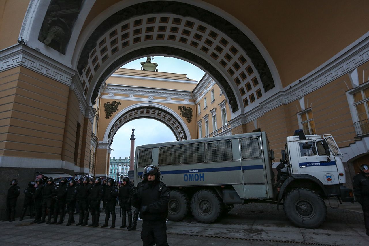 За несколько минут до предполагаемого начала акции в Санкт-Петербурге несколько бойцов ОМОНа в полном обмундировании выбрались из своих автобусов — покурить перед работой. На площади Пролетарской Диктатуры — рядом с администрациями Петербурга и Ленинградской области — в это время уже собрались как минимум две тысячи человек. В руках у них были транспаранты, в толпе раздавали листовки с таким содержанием: «Забастовка, Путин — вор, Навальный — президент, долой царя!» По периметру площади выстроились полицейские.
