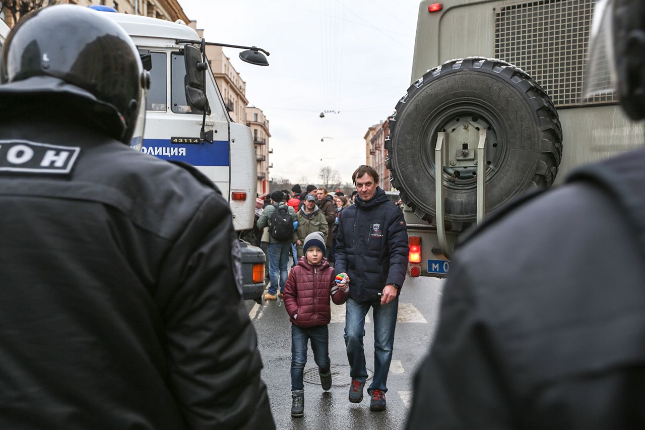 Так протестующие, постоянно подбадриваемые гудками проезжающих автомобилей, прошли по значительной части исторического центра Петербурга. «Жалко, без экскурсовода», — даже жаловались в толпе. Сторонники Навального шли мимо Таврического сада, театра на Моховой, цирка Чинизелли на Фонтанке, Михайловского дворца, Инженерного замка, храма Спаса на крови, Казанского собора. Оставалась только Дворцовая площадь, но путь туда загородили полицейские в шлемах.