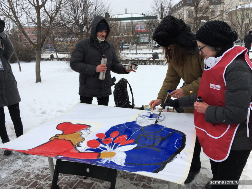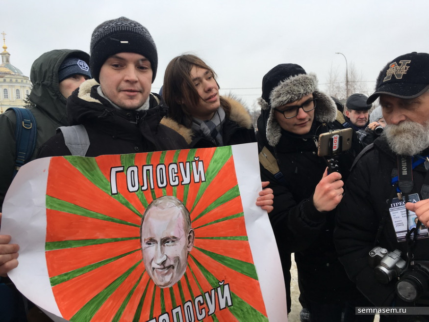 Тем временем сторонник кандидата в президенты Ксении Собчак в желтой шапочке с надписью «Против всех» расчехлил гитару и собрал вокруг себя любителей гражданских песен, а девушка, назвавшаяся псевдонимом Ен, и молодой человек по имени Тен тут же, в сквере, раскрасили рисунок: ребенок дарит цветы полицейскому.