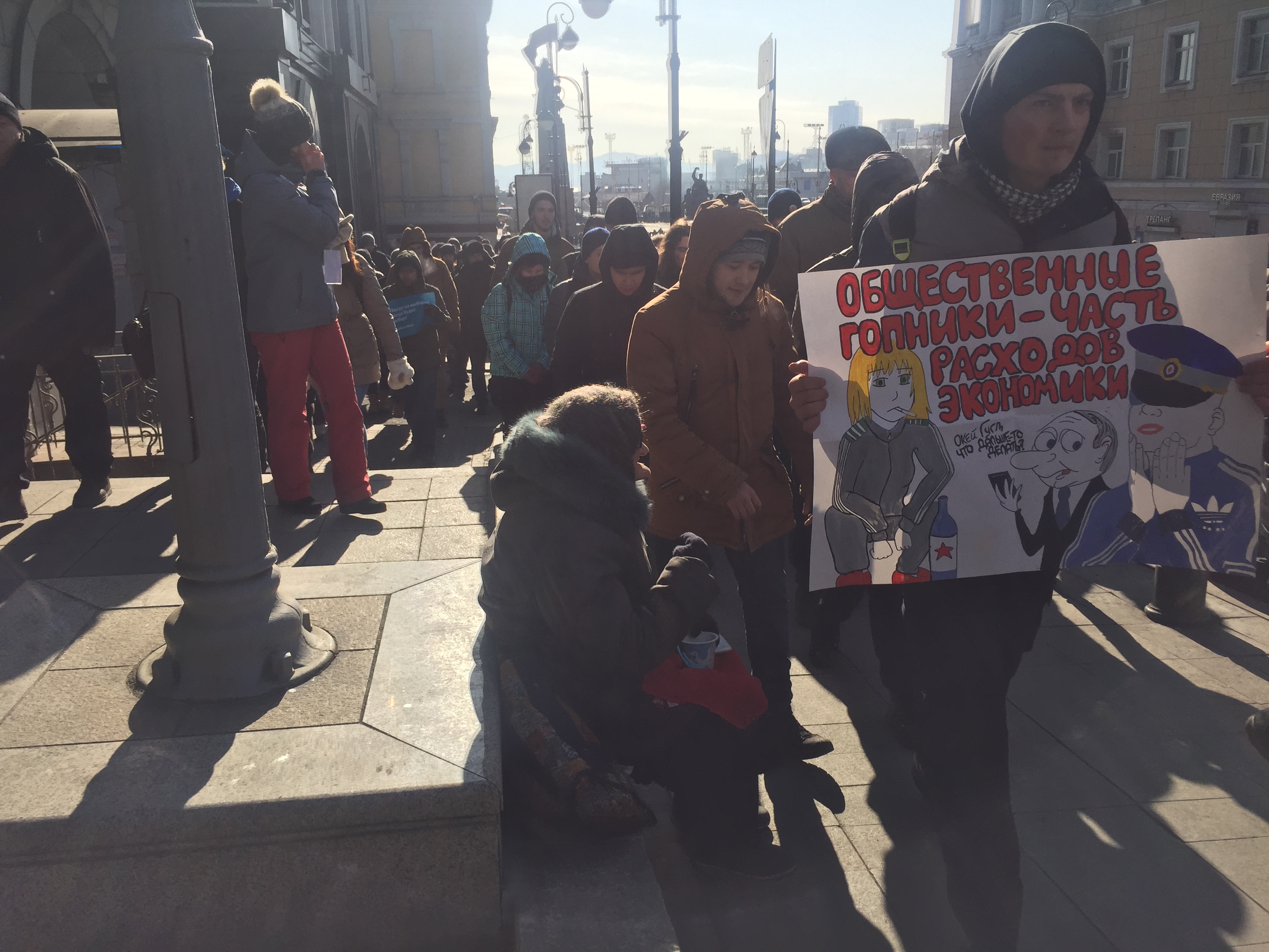 Одним из немногих городов, где акция была не согласована властями, стал Владивосток. Несмотря на это, ближе к 14.00 участники начали собираться у Центральной площади. Многие тут же посетовали, что с погодой сегодня не повезло: дул сильный пронизывающий ветер. Площадь оказалась перекрыта снегоуборочной техникой, несмотря на полное отсутствие снега как такового. Правда, в центре площади лежала небольшая куча наваленного кем-то льда – люди терялись в догадках, откуда он взялся, ведь ледового городка на площади в этом году не было. Да и бульдозеры лед убирать не спешили – стояли, выполняя функцию заграждения.