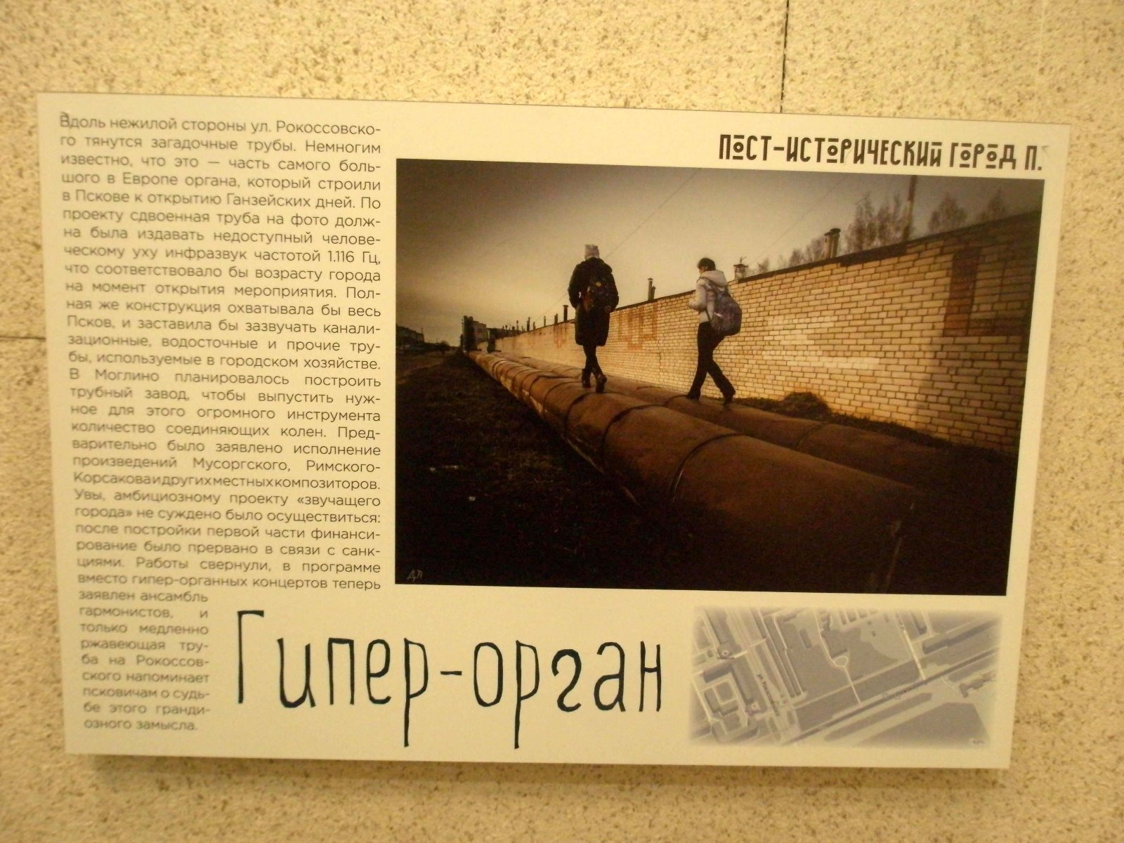 Алексей Жихаревич, Дмитрий Лебедев и их единомышленники из фейсбучных групп «Реальный Псков» и «Пост-исторический город П.» выбрали другой путь. Они принялись всё это изображать и комментировать. Причём не ограничились только словами и фотографиями. Дмитрий Лебедев и Алексей Жихаревич записали и обработали ещё и городские звуки. Шумы прямо из сердца города и других частей «тела». Они тоже звучали во время презентации.