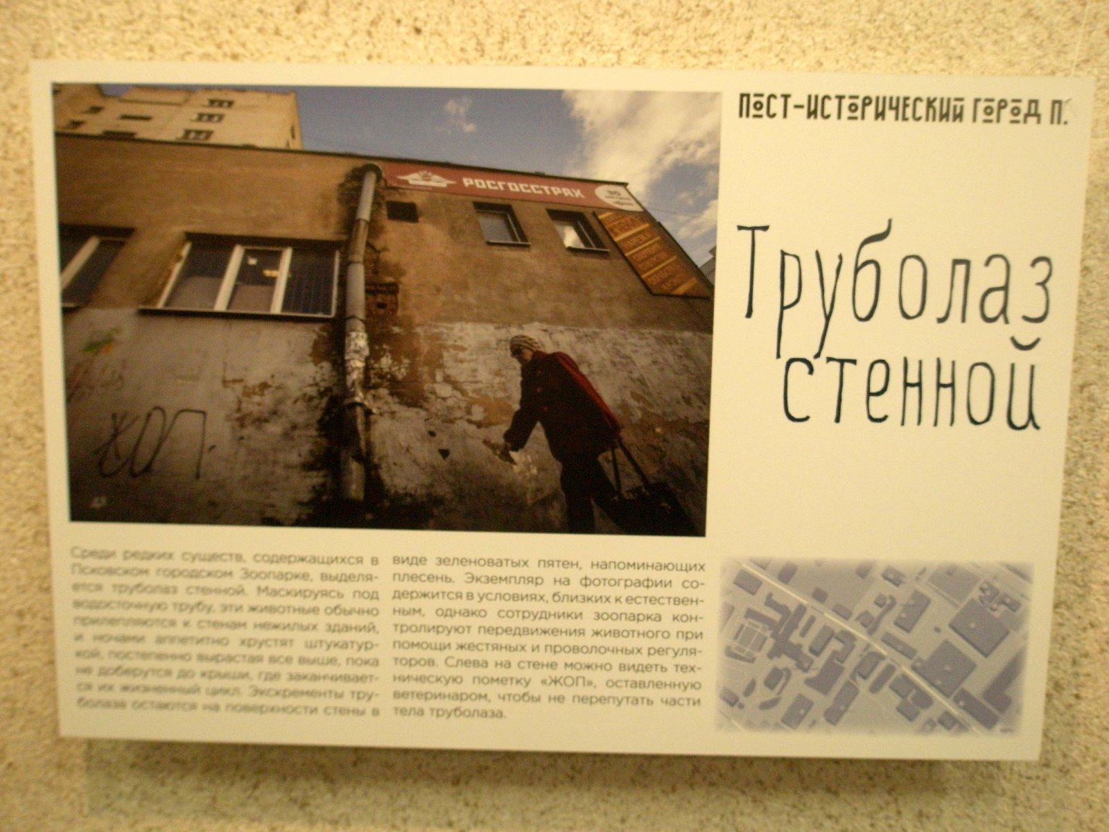 Собственно, тексты, написанные Алексеем Жихаревичем, в значительной степени и определяют настроение. Напиши под этими же фотографиями что-нибудь вроде «быдло», «доколе?», «дыра», то картина бы получилась беспросветная. Но пространные подписи приводят совсем к другим выводам: «Среди редких существ, содержащихся в Псковском городском зоопарке, выделяется труболаз стенной. Маскируясь под водосточную трубу, эти животные обычно прилепляются к стенам нежилых зданий…»