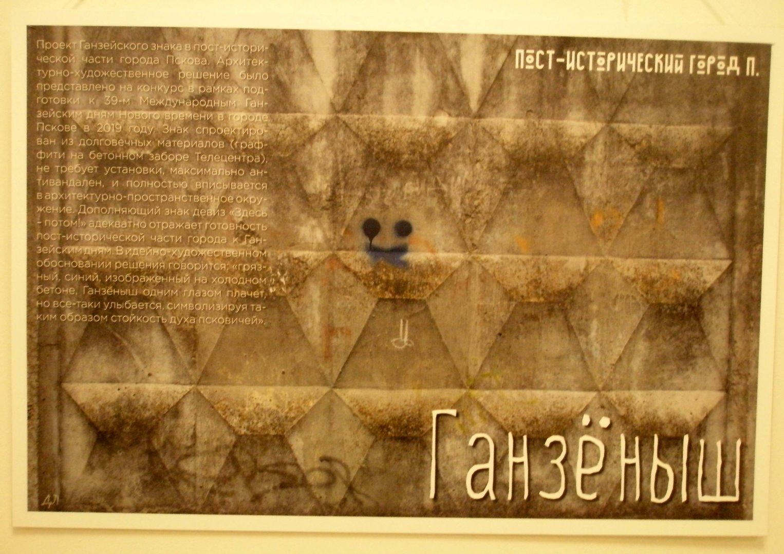 Или взять проект «Ганзёныш», в основе которого фотография бетонного забора псковского телецентра. На нём создатели «Объятий Родины» разглядели знак, как будто специально сделанный к 39-м Международным Ганзейским дням, которые пройдут в городе П. в 2019 году. Характеристика знака такая: «Грязный, синий, изображённый на холодном бетоне. Ганзёныш одним глазом плачет, но всё-таки улыбается, символизируя, таким образом, стойкость духа псковичей».