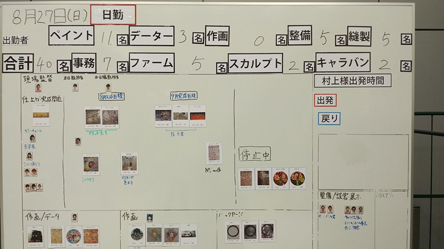 На выставке Такаси Мураками одна из пяти «глав» — это зона «Сутадзио» (то есть «студия»), рабочее место сотрудников Мураками. Здесь готовили выставку к открытию и прямо на месте создавали некоторые новые арт-объекты. Если учесть, что ещё одна её «глава» — это просто отдельные экспонаты, разбросанные тут и там, эта самая «Студия» представляет собой практически четверть экспозиции — монументальной выставки, которая знакомит зрителей с почти тридцатилетней карьерой Мураками и даже объясняет им некоторые штуки про японскую культуру (в частности, там можно увидеть бесценные рисунки XIX века из Пушкинского музея и поглазеть на оригинальные, штрихованные ручкой листы манги «Босоногий Гэн» — японской школьной классики).