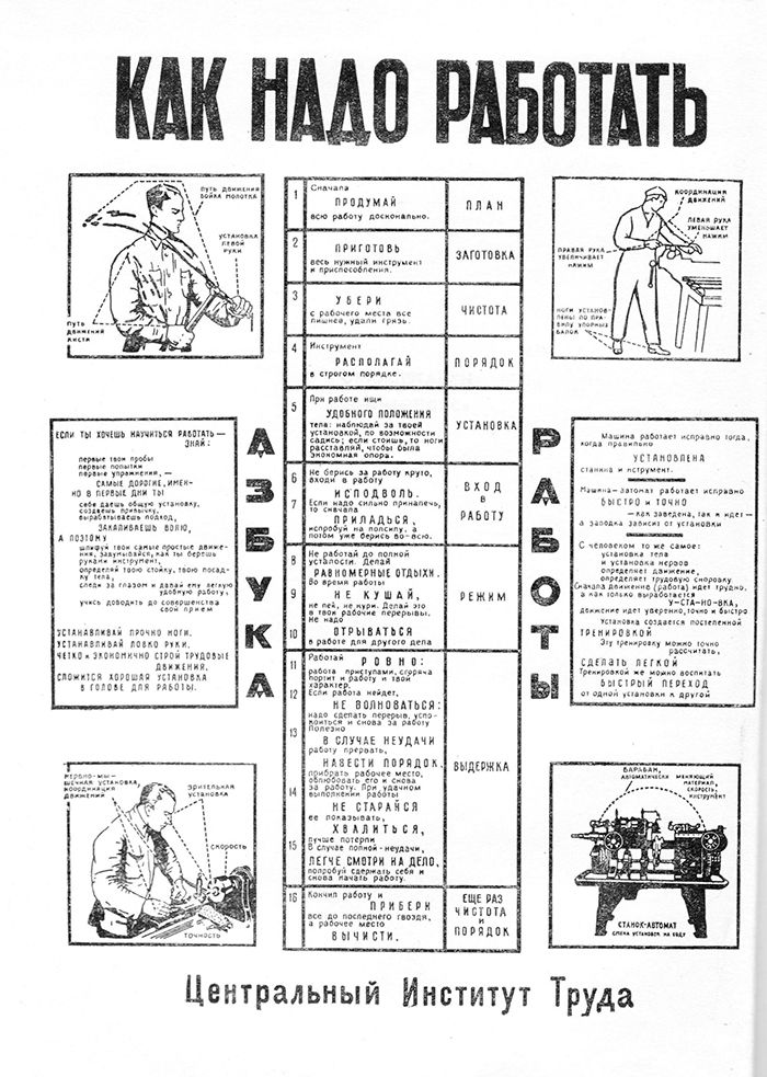 В Советском Союзе тоже был свой художник труда — Алексей Гастев. Это его памятку «Азбука труда» можно найти в интернете с подписью: «висела в приёмной Совнаркома». Действительно, висела. Гастев был авангардным поэтом, заводским рабочим, руководил боевой дружиной и поднимал на восстание солдат во время революции 1905 года, трижды был в ссылке, бежал в Париж, где трудился на «Ситроен». А затем в 1921-м основал на Петровке Центральный институт труда.
