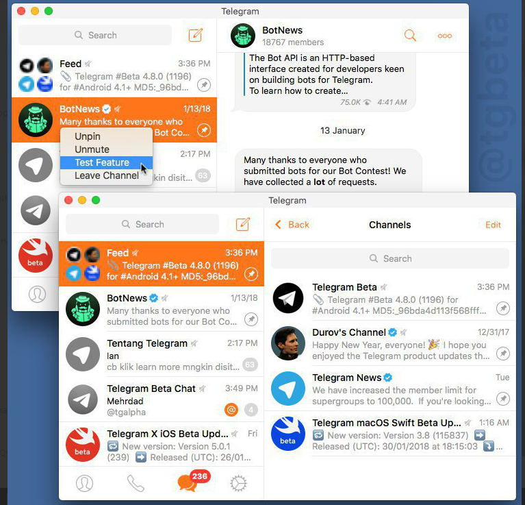 Telegram тестирует функцию, которая позволит собирать каналы в отдельную новостную ленту. Она появилась в бета-версии приложения для macOS, однако позднее ее отключили со стороны сервера.