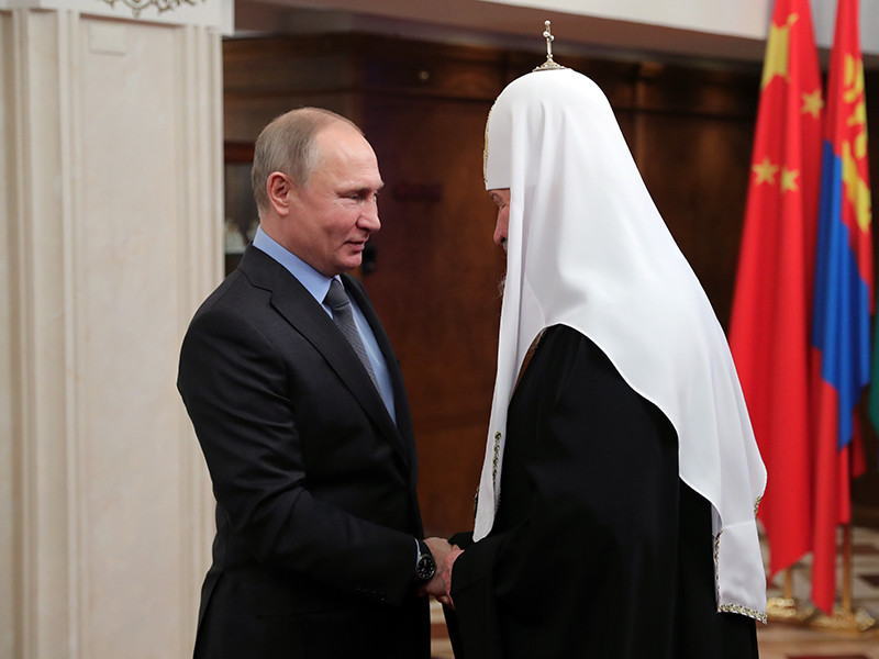 Патриарх принял от Путина белые розы по случаю годовщины своей интронизации и объяснил критикам, почему церковь "вся в золоте"