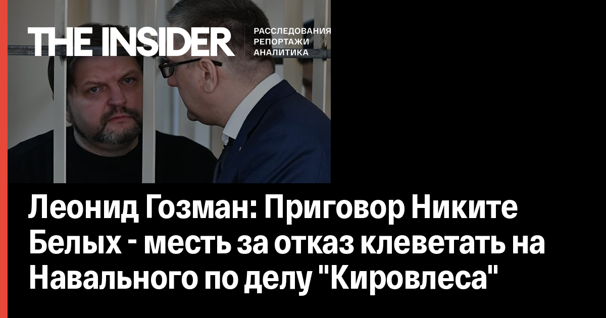 Пресненский районный суд Москвы признал экс-губернатора Кировской области Никиту Белых виновным в получении взяток в особо крупном размере и приговорил его к 8 годам колонии строгого режима. Белых также оштрафован на 48,5 миллиона рублей, в течение трех лет после освобождения он не сможет работать в госструктурах. По версии следствия, в 2012—2016 годах Белых лично и через посредников получил две взятки на общую сумму 600 тыс. евро за совершение законных и незаконных действий и бездействия в пользу взяткодателей и контролируемых ими АО «Нововятский лыжный комбинат» и ООО «Лесохозяйственная управляющая компания». Бывший соратник осужденного Леонид Гозман рассказал The Insider, почему считает приговор экс-губернатору несправедливым, что будет с осужденным, если его не помилуют, и чем Никита Белых мог обидеть лично Путина.