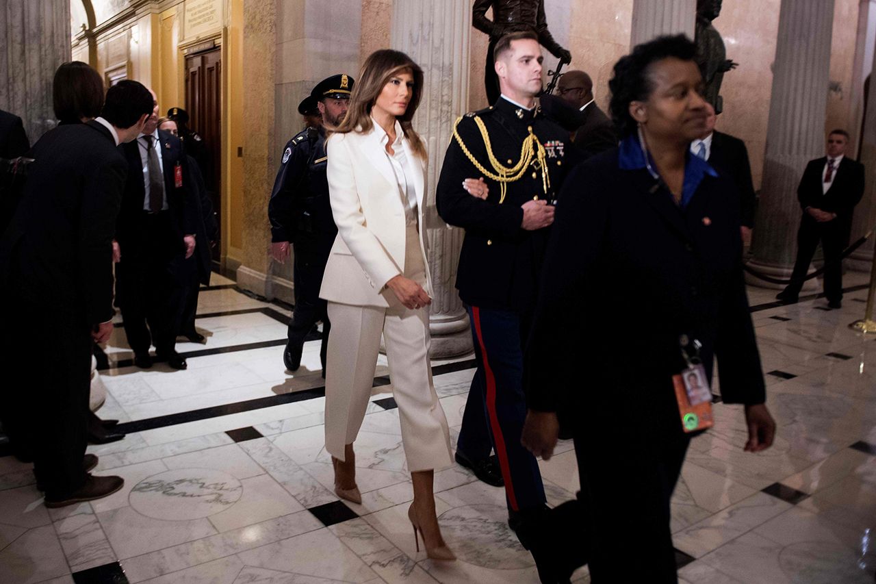 СМИ обратили особое внимание на наряд Мелании Трамп. Супруга президента США выбрала белый брючный костюм Dior. Канал ABC News отмечал, что этот костюм мог быть «приветом» белым нарядам суфражисток или фирменному белому костюму соперницы Трампа на президентских выборах Хиллари Клинтон. Журнал Vanity Fair писал, что костюм первой леди, возможно, отсылал к прошлогоднему событию: 1 марта 2017 года участницы демократической партии единогласно пришли на заседание Конгресса в белом — в знак протеста против мизогинии Дональда Трампа.