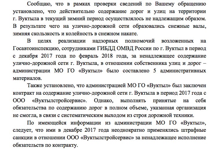 Во всех вуктыльских группах вконтакте народ возмущен. Я, как и положено, нарушения зафиксировал, написал в прокуратуру и в ГИБДД. Пришел ответ. Краткое содержание: