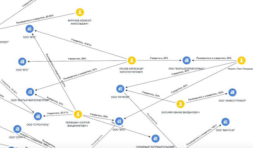 Мне стало любопытно, что же это за ООО «Вуктылстройсервис» такой, который 3 миллиона на содержание дорог получил, а у него все трактора поломались. Стал изучать и нарисовалась интересная картина всяких бизнес-связей города. Вот ее часть, непосредственно относящаяся к нашей истории: