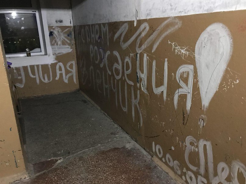 Стены в подъездах содержатся примерно в таком же состоянии. 12 лет назад тут появилась вот эта надпись. А за содержание подъезда квитанции приходят каждый месяц: