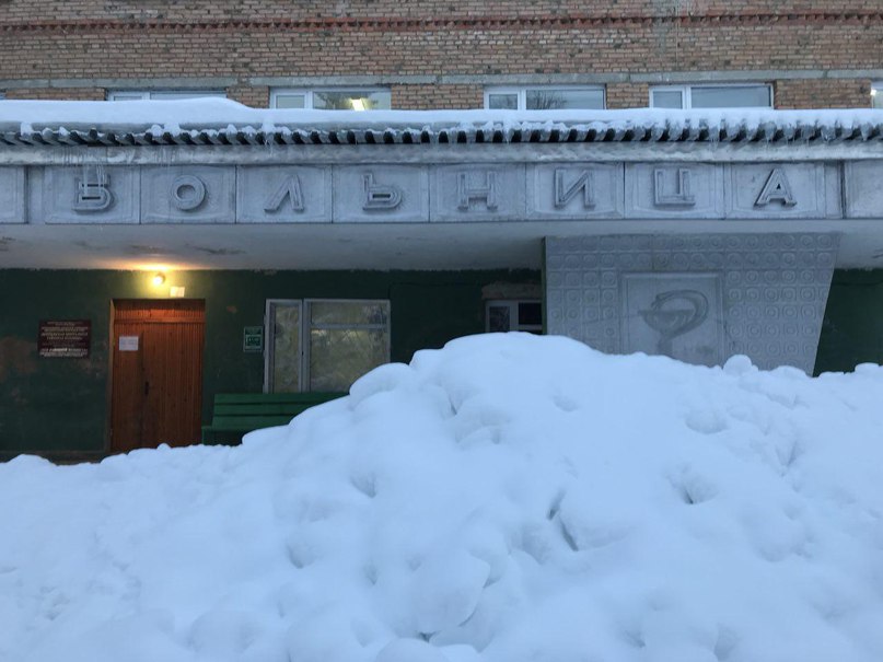 Там где снег все-таки сгребают, то разумеется не вывозят, снежные валы формируют где придется, то у перекрестков, то вообще у больницы вот накидали: