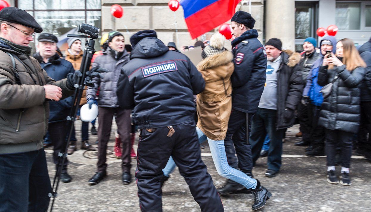 I was as careful as possible, knowing that the demonstration didn’t have a permit and that there might be trouble or provocations. People started assembling at about 2:00 p.m. Thirty minutes later, the crowd set off down Lenin Avenue, heading for downtown. The police — including riot police — blocked the crowd's path at the exit leading out from a pedestrian tunnel. The demonstrators had only come about 150 meters [about 500 feet]. This is where the police started detaining people.