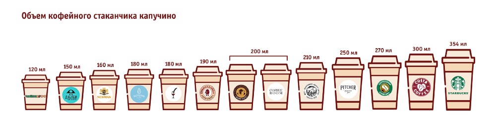 Авторы исследования сравнили объем маленького стакана капучино в разных кофейнях города. В ноябре 2017 года стакан с кофе самого большого объема продавали в Starbucks — 350 мл. В Costa Coffee подают 300 мл кофе, а в Pitcher — 250. Самый маленький стаканчик оказался в кофейне «Чайникофф» — всего 120 мл.