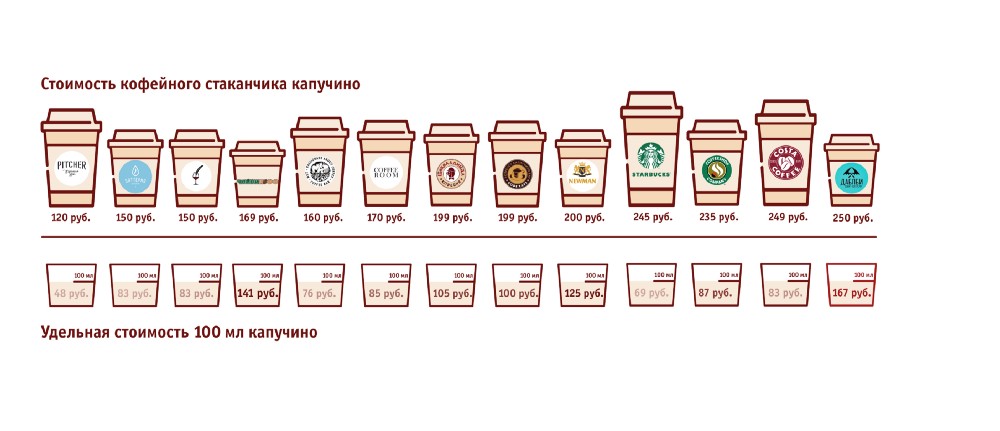 Самым дорогим на момент начала исследования был маленький стакан капучино в кофейне «Даблби», которая занимает второе место с конца по объему напитка, — 250 рублей. За 245 и 235 рублей можно было купить кофе в Costa Coffee и Coffeeshop Company соответственно. Самый дешевый капучино в декабре 2016-го продавался в Pitcher — 120 рублей.
