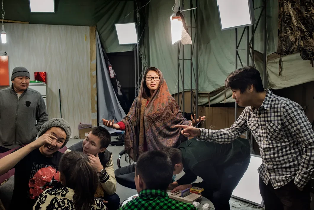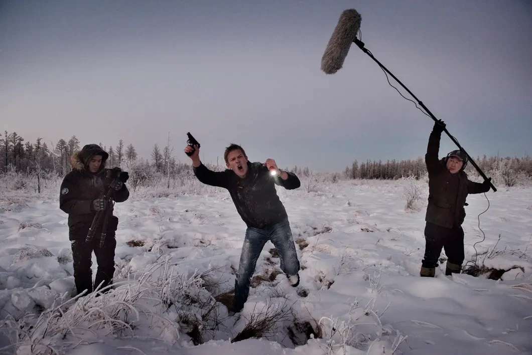 «Якутский Тарантино» Степан Бурнашев (слева), на съемках своего нового фильма ужасов «Хара Дьай». Он называет его «экспериментальным» — потому что над фильмом работает команда всего из двух человек — Степан и его приятель Евгений Осипов (справа). Актер Владимир Седельников (в центре), пилот в реальной жизни, мечтает снять свой собственный фильм — что-то вроде Индианы Джонса. Якутск, Ноябрь. 2015 г. Фото: Юрий КОЗЫРЕВ / «Новая»Деревенский учитель Дмитрий Давыдов (в синей жилетке) работает над своим вторым фильмом — социальной драмой «Костер на ветру», на создание которой он взял кредит 10000 евро. Исполнитель главной роли Алексей Устинов (слева), бывший водитель грузовика. Якутск, Ноябрь. 2015 г. Фото: Юрий КОЗЫРЕВ / «Новая»Съемки социальной драмы «Костер на ветру» режиссера Дмитрия Давыдова. В 2017 году фильм удостоен трех наград Национального кинофестиваля дебютов «Движение» и приза канадского ImagineNATIV. Якутск, Ноябрь. 2015 г. Фото: Юрий КОЗЫРЕВ / «Новая»Съемки фильма ужасов «Хара Бэкир / Черный демон» режиссера Константина Тимофеева (в центре, в очках). Якутск. Ноябрь, 2015 г. Фото: Юрий КОЗЫРЕВ / «Новая»Съемки фильма ужасов «Хара Бэкир / Черный демон» режиссера Константина Тимофеева. Якутск. Ноябрь, 2015 г. Фото: Юрий КОЗЫРЕВ / «Новая»Репетиция в Якутской опере: «Князь Игорь» Александра Бородина. Режиссер оперы Андрей Борисов — бывший министр культуры Якутска. Кроме того, автор первого высокобюджетного якутского кино «Тайна Чингис Хаана». Фильм совместного производства Монголии, России и США, вышедший девять лет назад, зрители оценили невысоко: из бюджета в 10 миллионов долларов через кассы вернулось чуть более миллиона. Якутск, Ноябрь. 2015 г. Фото: Юрий КОЗЫРЕВ / «Новая»Репетиция в Якутской опере: «Князь Игорь» Александра Бородина. Якутск, Ноябрь. 2015 г. Фото: Юрий КОЗЫРЕВ / «Новая»Василий Булатов (справа, в клетчатой рубашке) на съемочной площадке первого якутского ситкома. Команда обычно работает в ночное время, после основной работы, так как сериал делается без средств. Якутск, Ноябрь. 2015 г. Фото: Юрий КОЗЫРЕВ / «Новая»На съемочной площадке нового новогоднего кино в главной школе-интернате Якутии. В главной роли актер Геннадий Турантаев. Фото: Юрий Козырев / «Новая»Команда ДетСат, сокращенно от «Дети Саха-театра», славится своими комедиями. Их фильмы — блокбастеры в Якутске. Алексей Егоров (крайний справа) в настоящее время является руководителем Театра Эстрады, Дмитрий Шадрин (в центре, в капюшоне) стал руководителем государственной кинокомпании «Сахафильм», а Степан Порядин (в красной куртке) — новая молодая звезда кино Якутии. Фото: Юрий Козырев / «Новая»