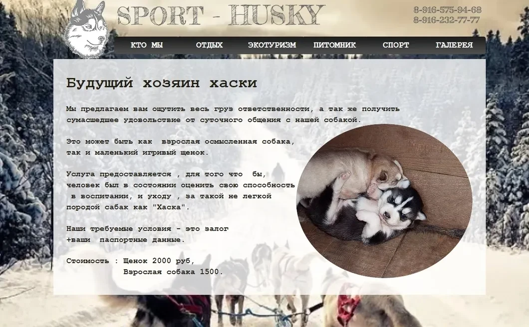 На сайте подворья Рудакова есть объявление о необычной услуге «Будущий хозяин хаски»: щенков (2000 руб.) и взрослых собак (1500 руб.) сдают в посуточную аренду.
