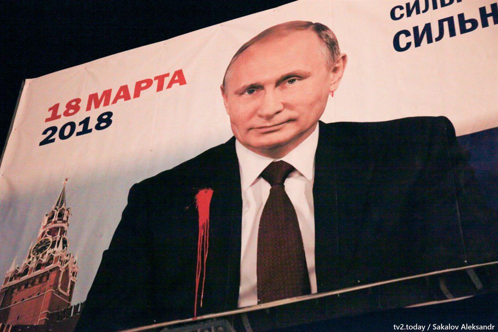 В Томске неизвестные из пейнтбольных ружей обстреляли краской рекламные щиты с изображением кандидата в президенты России Владимира Путина. Как сообщает ТВ2, были испорчены как минимум два баннера.