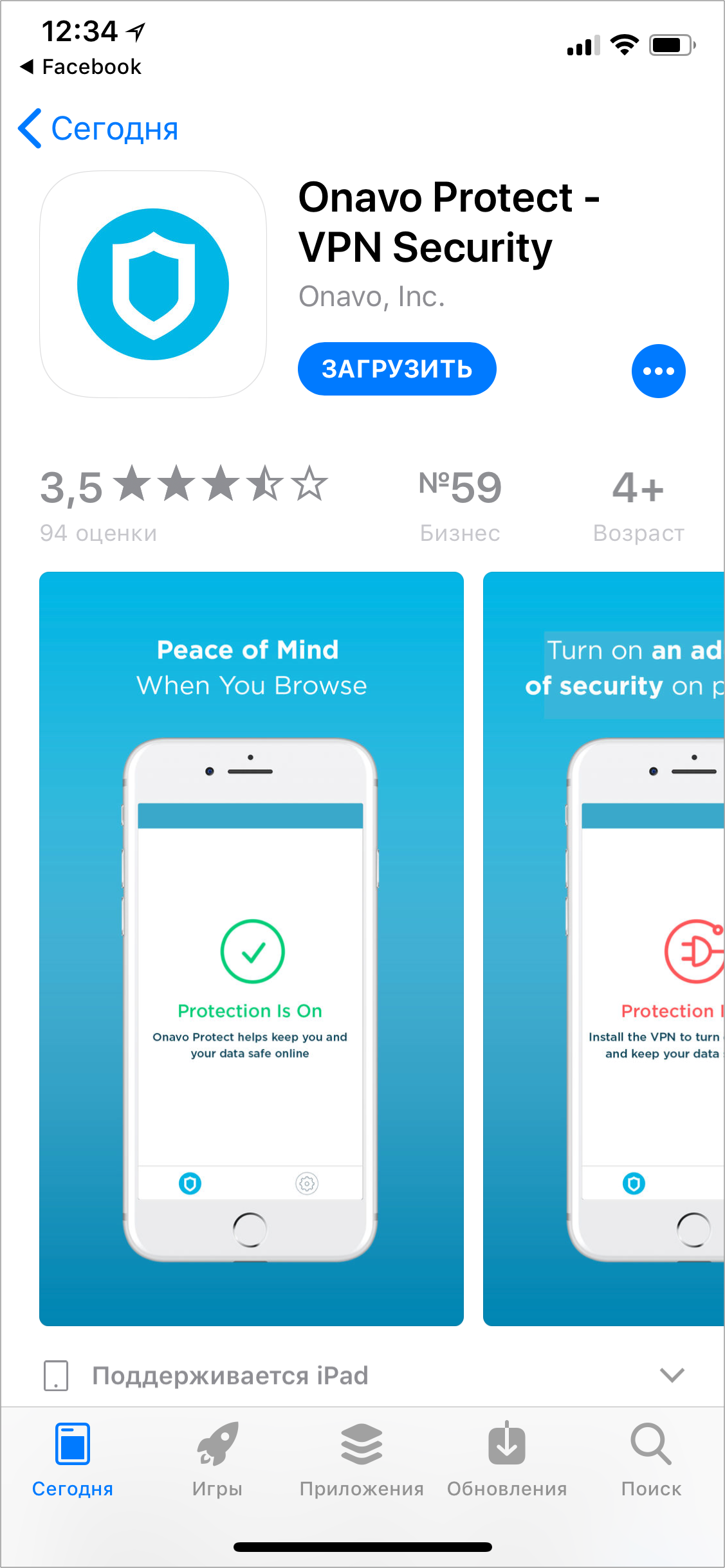 В мобильном клиенте Facebook появилась кнопка «Protect» («Защитить»), которая ведет пользователей напрямую на страницу приложения Onavo Protect в App Store.