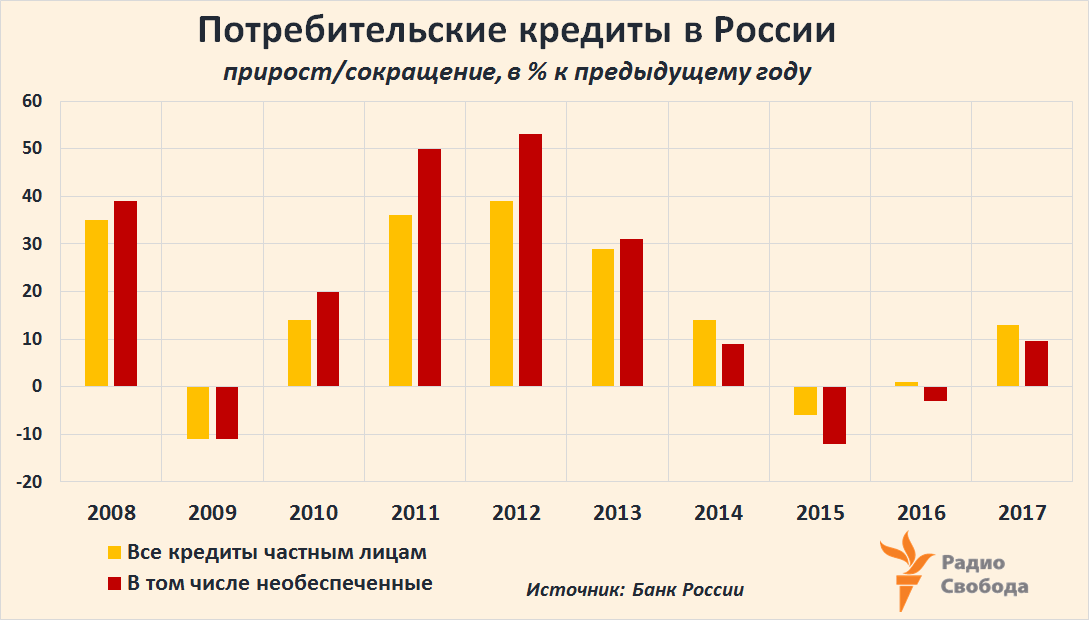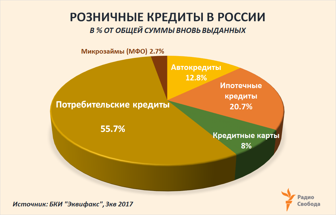 В 2017 году российские банки, по оценкам НБКИ, предоставили потребительских кредитов (по количеству) почти на 21% больше, чем годом ранее, а средний размер такого кредита вырос за год примерно на 13% – до 141 тысячи рублей ($2450 по текущему обменному курсу).