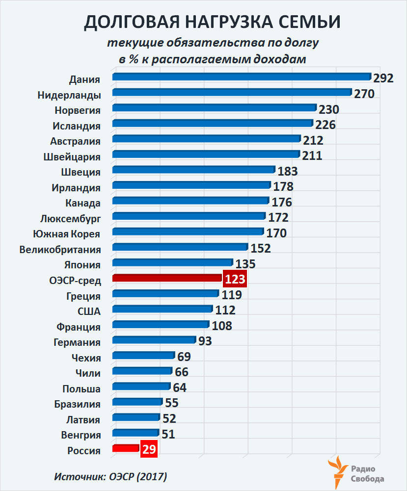 А например, по данным Организации экономического сотрудничества и развития (ОЭСР), объединяющей на сегодня 35 наиболее индустриально развитых стран мира, уровень закредитованности российских семей в 2015 году (более поздние оценки пока не представлены) составлял 29%. И это, как видим, в разы меньше, чем во многих других странах мира, статистику по которым представляет ОЭСР. Но в данном случае речь идет о соотношении всех долговых обязательств семьи-заемщика, имеющихся на конец очередного календарного года, и ее общих располагаемых доходов в течение этого года: