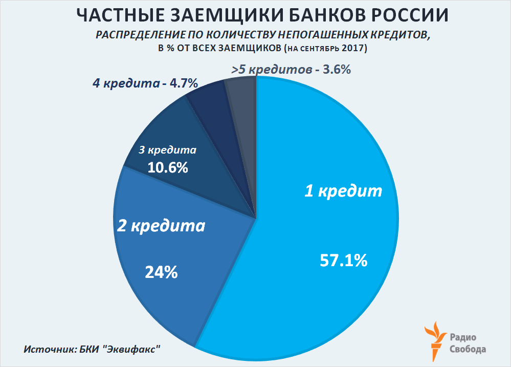 В сентябре 2017 года, по оценкам БКИ “Эквифакс”, более 40% частных российских заемщиков имели на руках два и более непогашенных на тот момент банковских кредита: