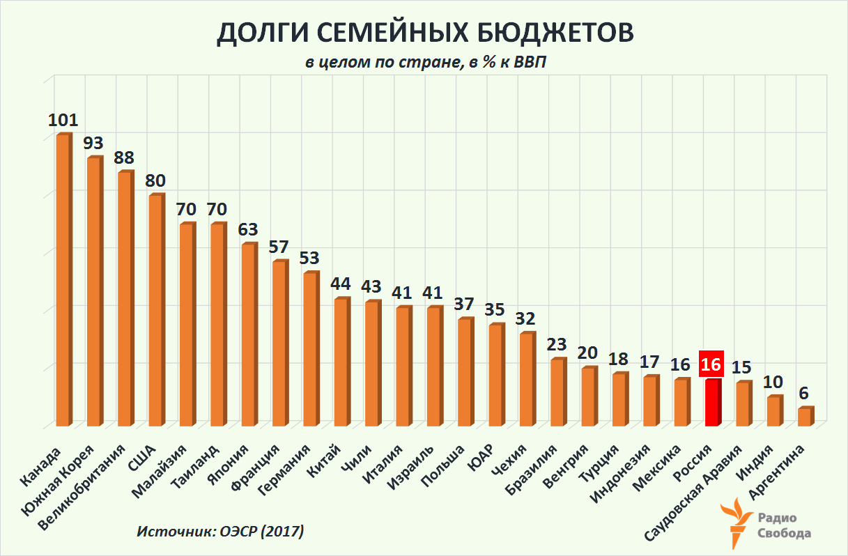 По тем же данным ОЭСР, общий накопленный долг российских семей по отношению к объему национальной экономики (ВВП) также в несколько раз меньше, чем в других странах – причем не только наиболее индустриально развитых, но и во многих развивающихся: