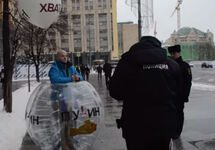 Пашин добавил, что зорб (прозрачный шар для экстремального спорта - спуска с горы или плавания по водоемам) диаметром 1,5 метра, в котором он проводил перформанс, в полицейском протоколе был назван "сборно-разборной конструкцией".