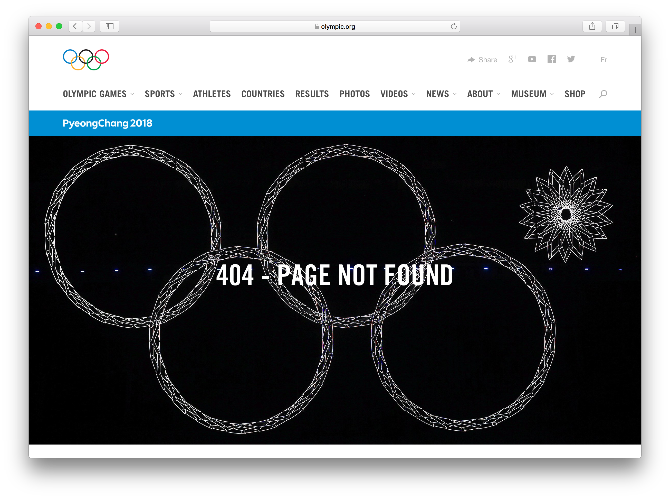 Пользователи обнаружили, что на сайте Международного олимпийского комитета (МОК) необычная страница 404, которая открывается, когда кто-то пытается перейти по несуществующей ссылке. На ней изображено нераскрывшееся кольцо Олимпиады в Сочи!