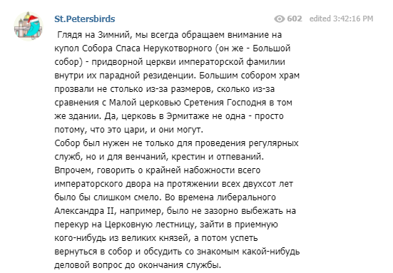 Кроме исторических сводок и фактах об архитектуре, в канале можно почитать об особенностях интерьеров тех зданий, в которые автору удается попасть.